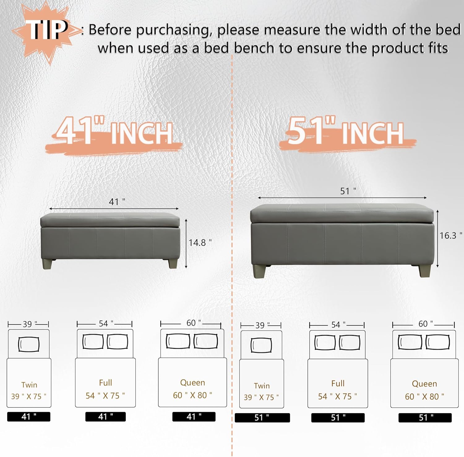 - OVERALL DEMENSION: The overall size of UDAX faux leather ottoman is 51.25‘*17.5’*16.25‘. Our storage bench is wide enough to sit cozily and large enough to store your blanket, clothes, children's toys, and so on. It has plenty of space to help you organize every corner of your home.