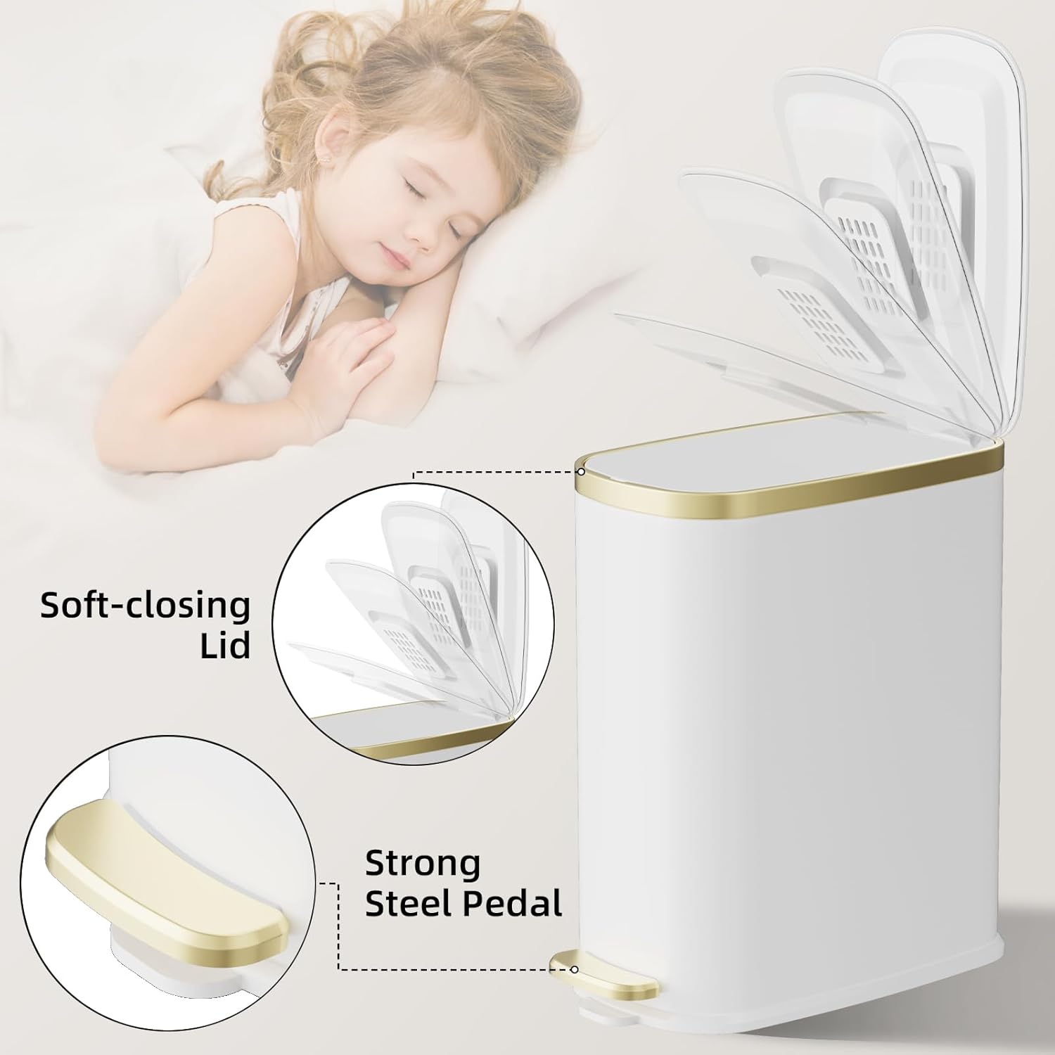 - 【Soft Close & Stay-Open Lid】Enjoy silent, gentle closure with the built-in damper—no loud slams to disturb family or pets. The lid stays open at 90° for hands-free trash disposal, making it easy to replace bags or clean. Enjoy a quiet, mess-free experience in any room.