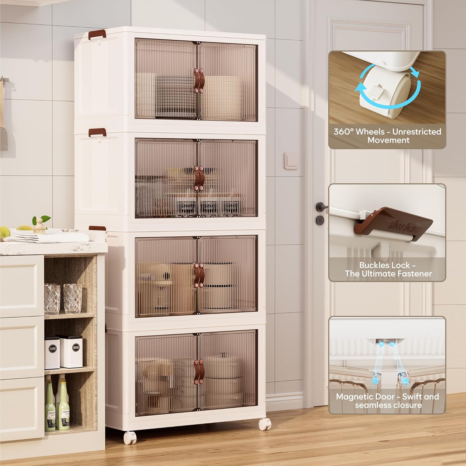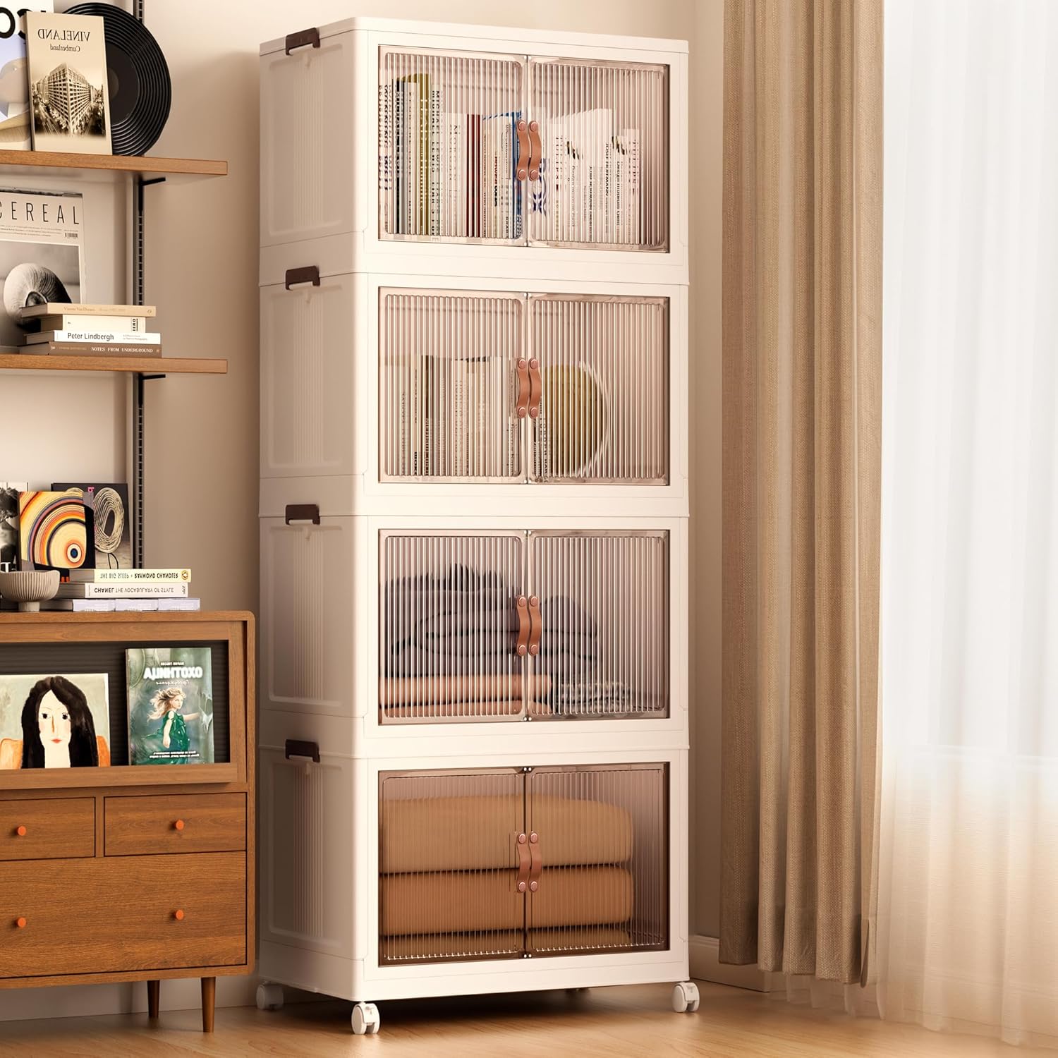 Jalove 50QT Plastic Storage Bins with lids, Stackable Collapsible Storage Containers with Wheels, Closet Organizer and Storage Drawers, Clothes Storage Cabinet for Home Office Garage, 4 Pack White
