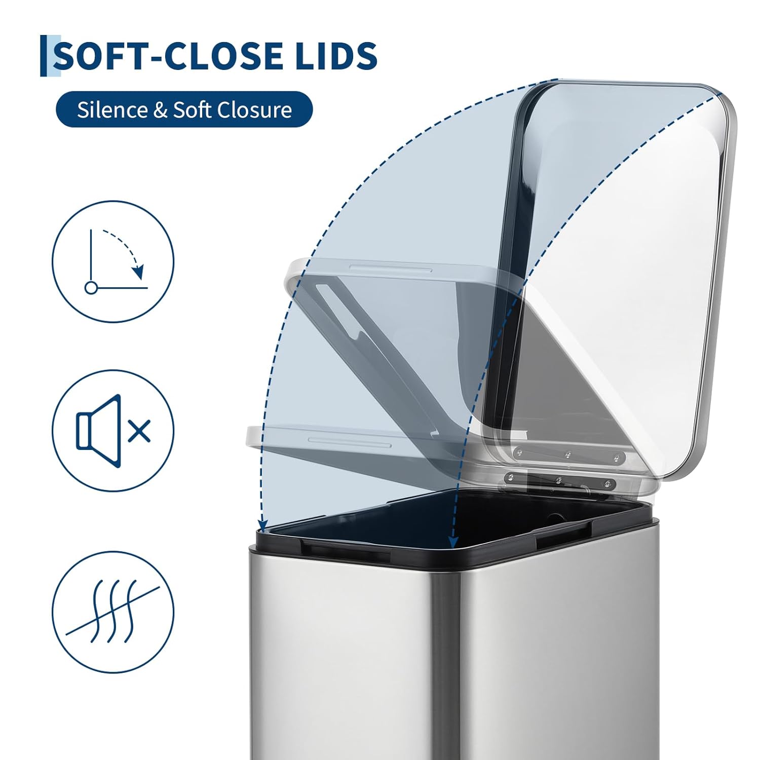- 【Silent Soft-Close Lid】The slow-closing lid prevents loud slams—perfect for late-night cleanup in kitchens or bathrooms. Enjoy a quieter home while keeping odors contained.