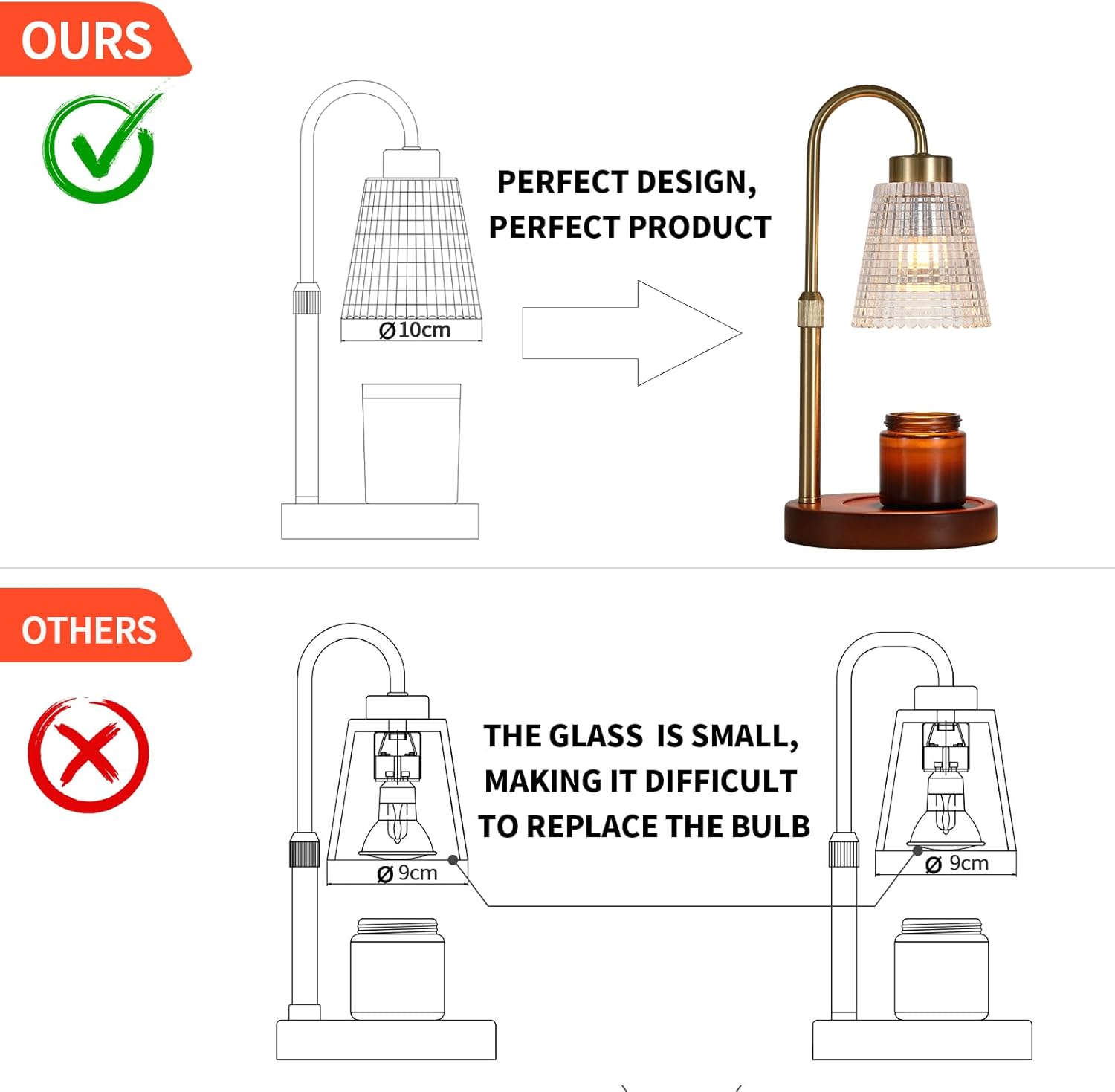 - Timer,Dimmer and Height Adjustment : Vintage modern electric candle warmer lamp uses a 50W GU10 halogen bulb and a dimmer switch to provide the perfect ambiance.Bedroom candle warmer lamp home decor with four levels of dimming,you can control the melting speed of the candle,the brighter the setting,the faster it melts.The wax melt lamp also features a 2/4/8-hour timer function for added safety,ensuring your candles don't burn continuously.Two 50W light bulbs are in the package (candle not included).Living room candle lamp with an easy turn of the button, the height can be adjusted up to 12.2