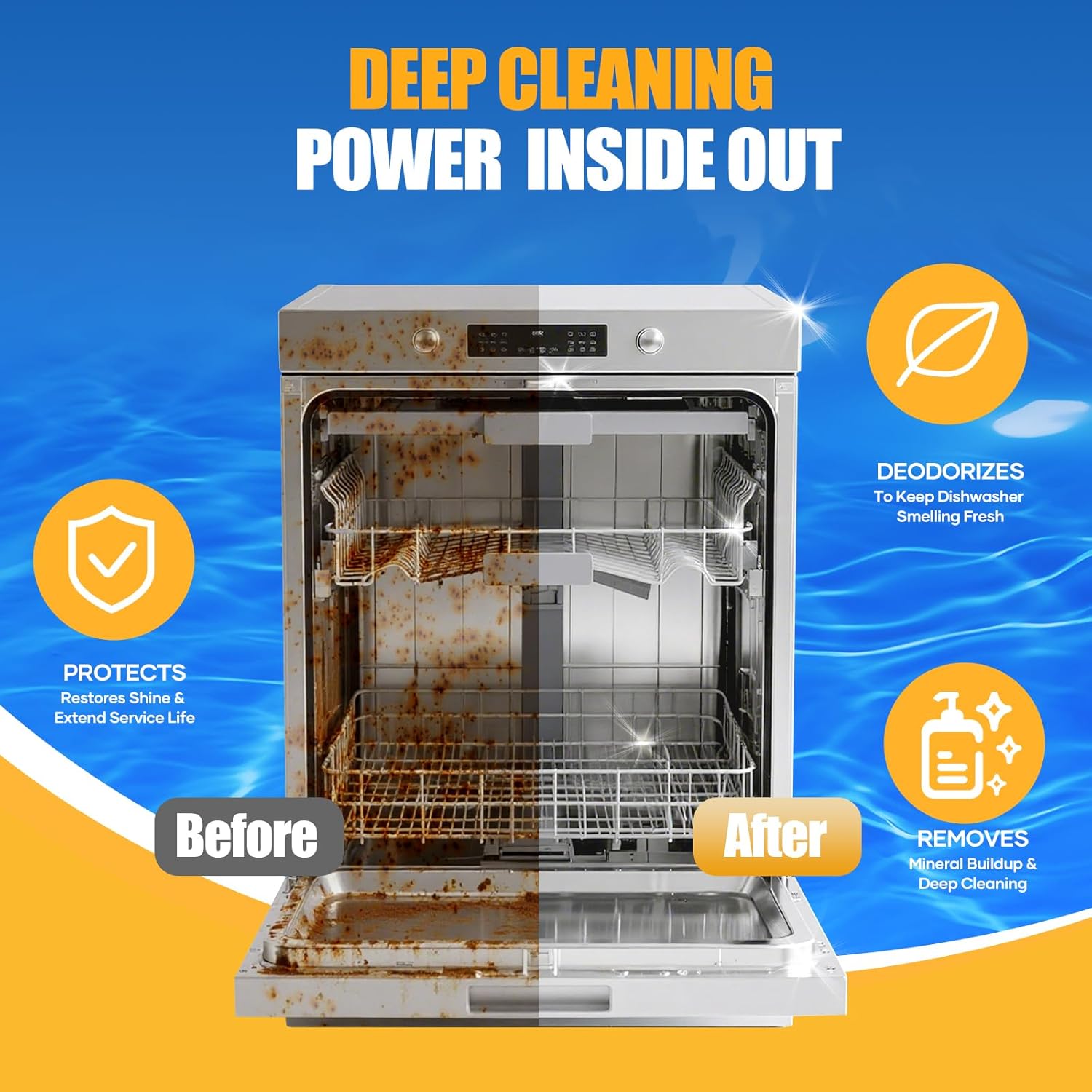- Professional-Grade Deep Cleaning for Spotless Results: Our dishwasher cleaner and deodorizer is formulated with high-performance ingredients that dissolve grease, and prevent mineral buildup. It works as a dishwasher descaler ensuring your machine stays clean and functions at peak efficiency. Whether you have hard water stains or old, stuck-on dirt, these dishwasher tablets deliver a deep clean with every use.