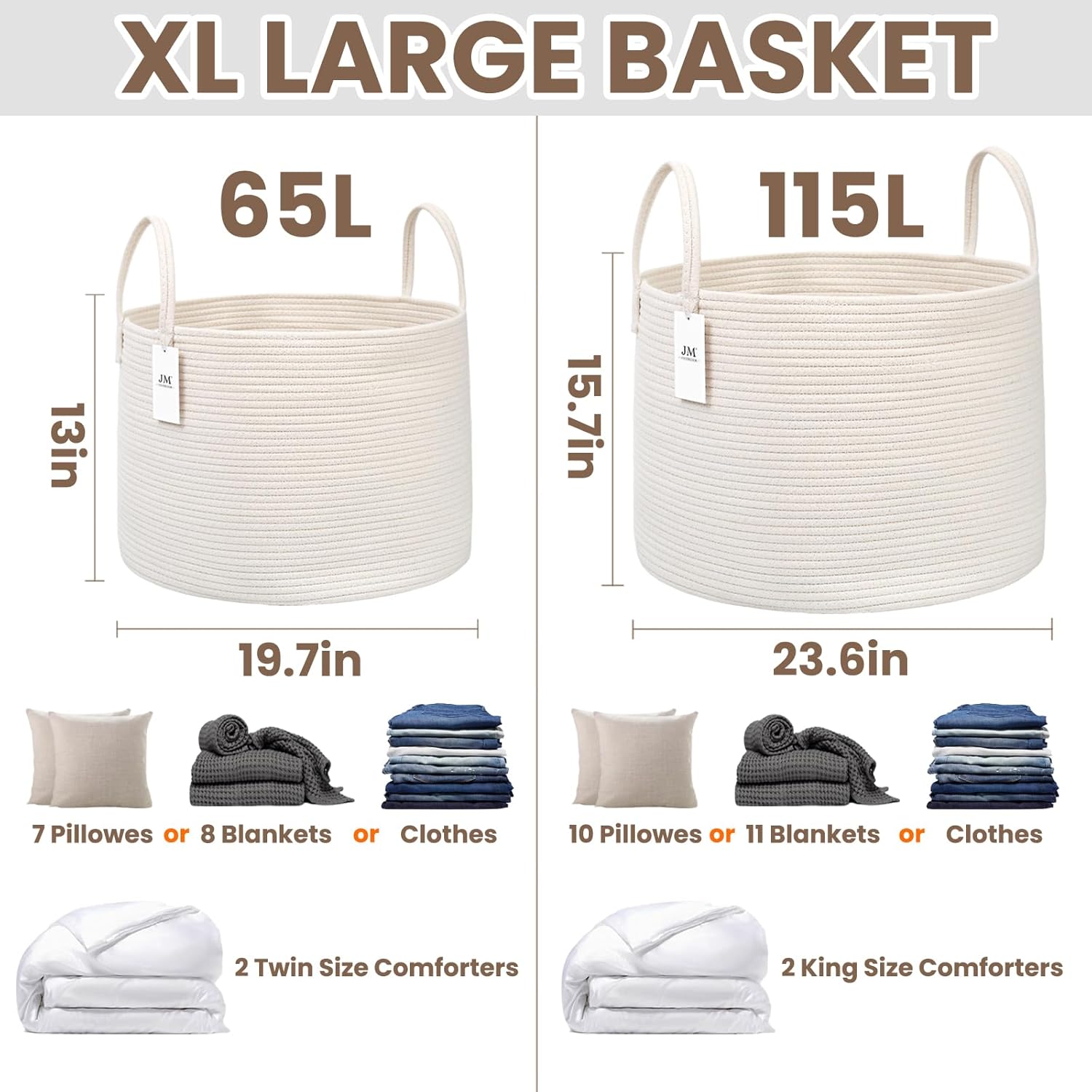 Woven Blanket Basket,65L Large Rope Storage Bin with Handles, Organizer for Blankets Toys Book and Clothes, Laundry Basket for Living Room Bedroom Nursery,White