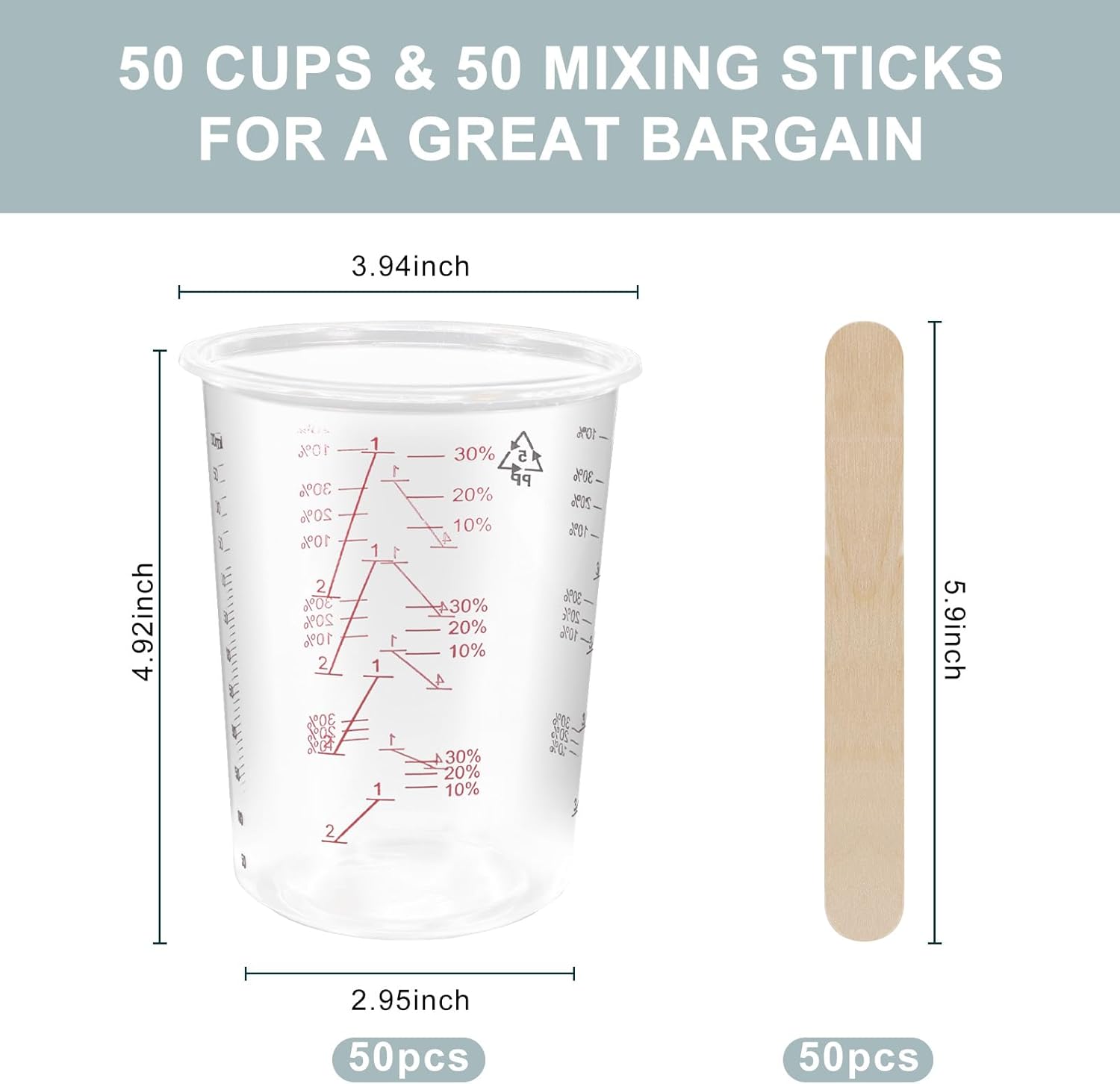 - Get 50 premium 20 oz plastic mixing cups and 50 sturdy wooden sticks. Effortlessly mix and measure, saving time and hassle for a seamless project experience
