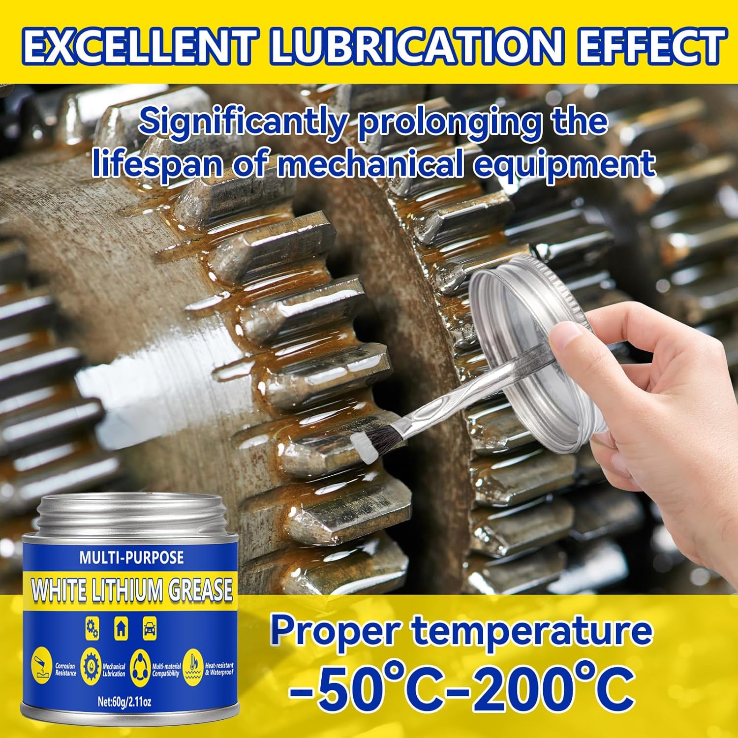 - Superior Lubrication: White lithium grease provides excellent lubrication, reducing metal-metal friction for smooth operation of hinges, bearings, gears, and chains. Lithium grease keeps your equipment running quietly and efficiently
