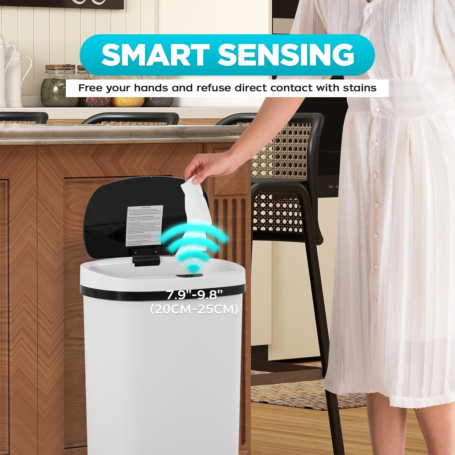 - Touchless Convenience: Experience the ultimate in hygiene with our Automatic Motion Sensor Bathroom Trash Can. Easily open the 13 Gallon Touchless Trash Bin using knee or hand gestures, eliminating contact and maintaining cleanliness in your home.