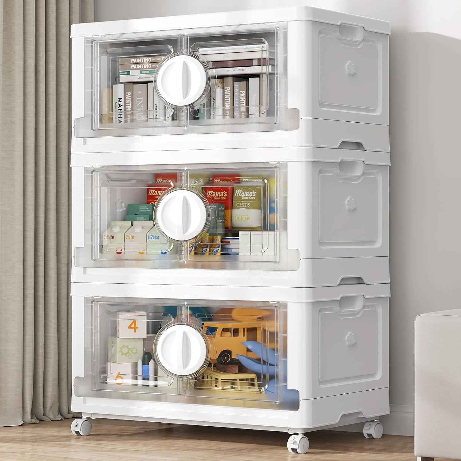 BROVIEW 360Qt Lockable Stackable Storage Bins with Lids, Closet Organizers and Storage Drawer, Collapsible Storage Bin with Wheels, Plastic Cabinet for Toy Clothes Dorm Organizer, V9 3 Pack White