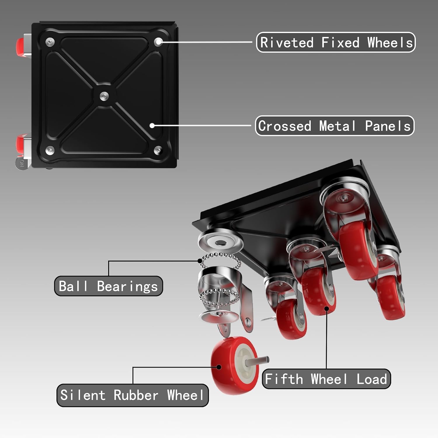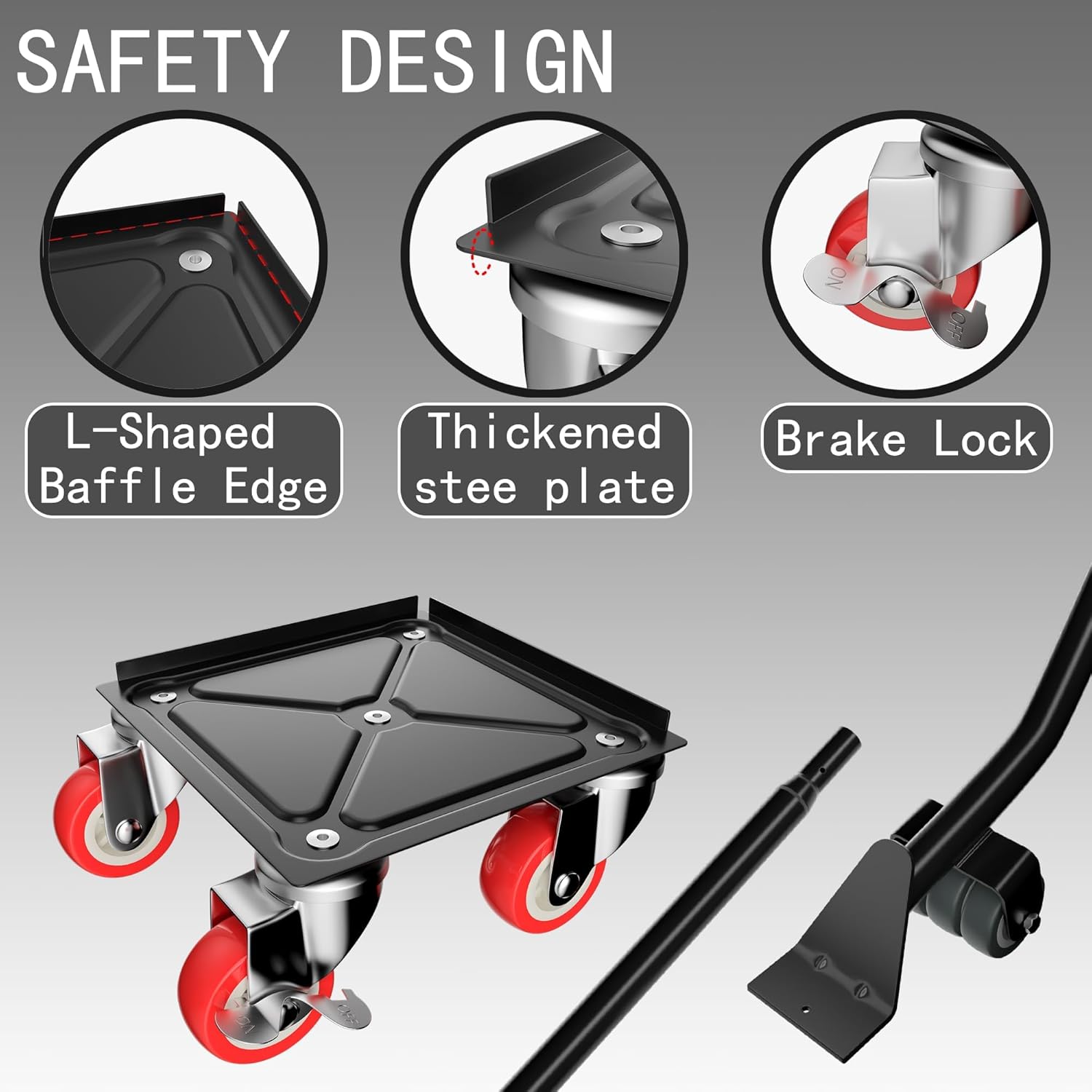 - [NEW UPGRADED DESIGN]:Furniture dolly with wheels uses a larger load-bearing panel with a fifth wheel in the center to increase the load-bearing capacity;designed with L-shaped retaining edge,not easy to slip off during handling,with two locking switches can be fixed at any time,anti-pressure handle tow hook can effectively protect fingers.