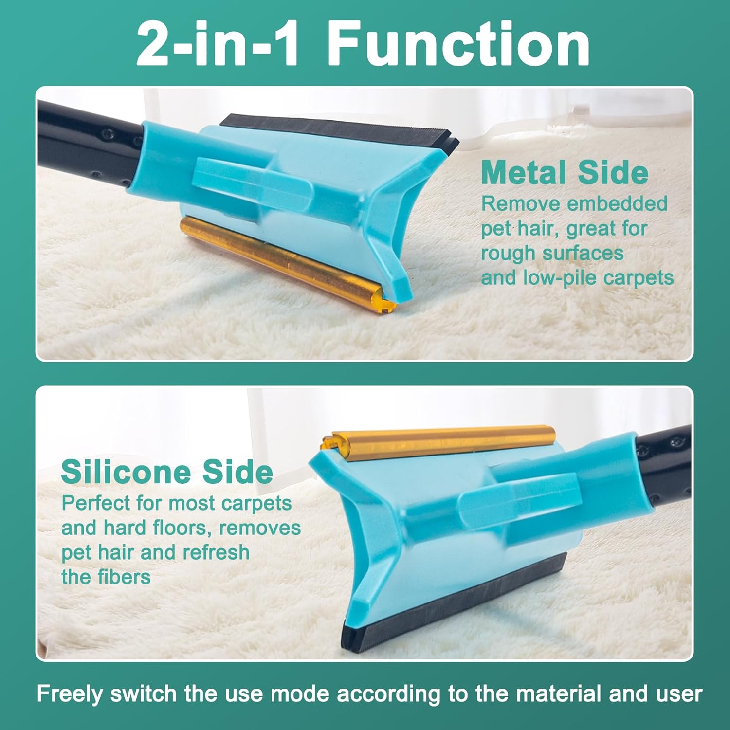 - 🐱【2-in-1 Carpet Rake】The metal side features copper bristles for deep cleaning of rough and long-pile carpets, while the silicone side features a serrated design for gentle cleaning without damaging the surface. Comes with a mini pet hair removal tool that can be used on non-knit fabrics