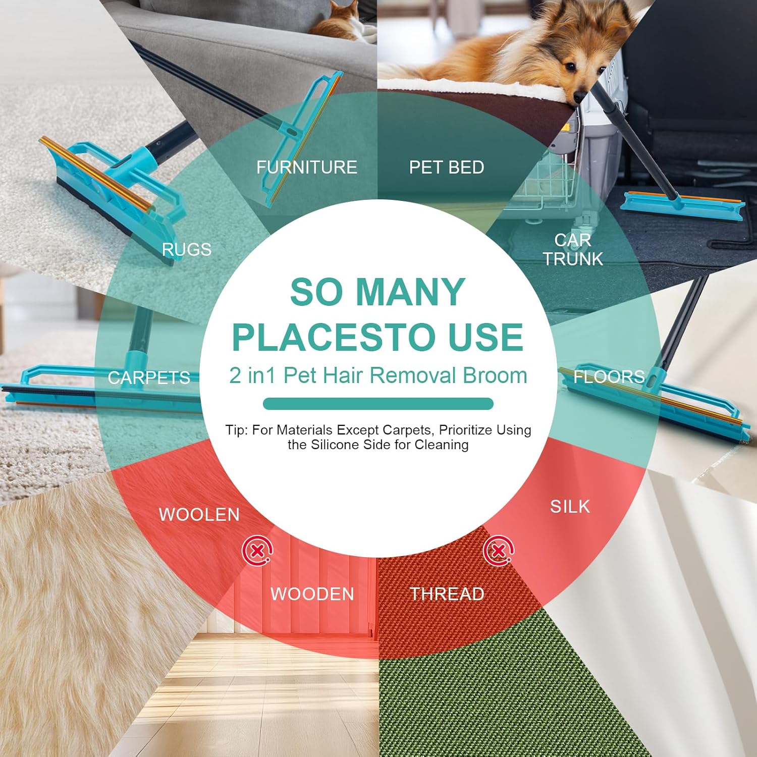- 🐱【Muli scene Hair Removal Broom】Works on carpets, rugs, pet beds, sofas, stair, car mats, and cat trees. (Tip: For Materials Except Carpets, Prioritize Using the Silicone Side for Cleaning. Don't Use on Knitted Fabrics and delicate fabrics)
