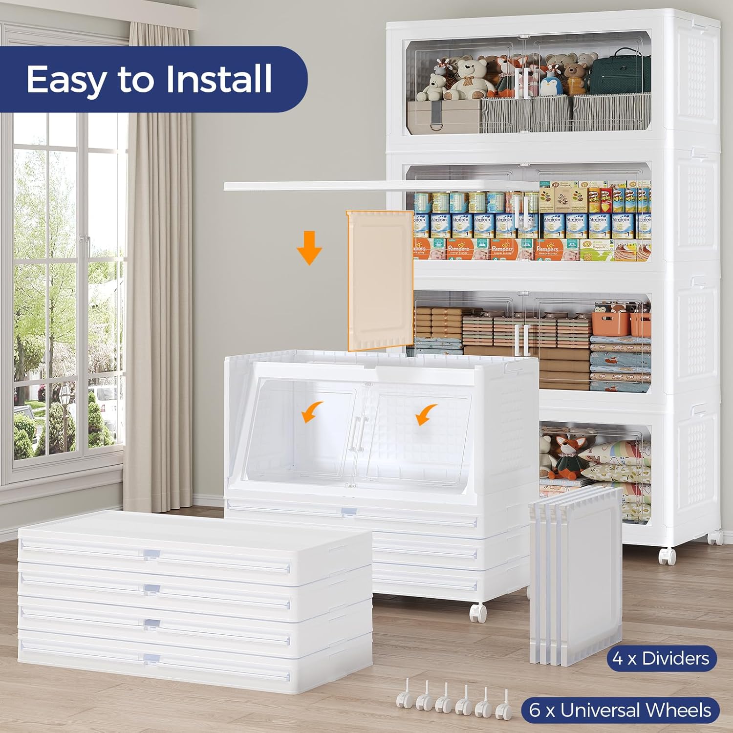 - 【Two Ways to Open & Clear Magnetic Doors】Fangtueh collapsible storage bins with lid and wheels feature a dual access way, allowing for both top and front door openings, and with clear windows for easy visibility. The stackable plastic storage bins with open front doors are equipped with magnetic lock buckles to prevent dust from entering the cabinet.