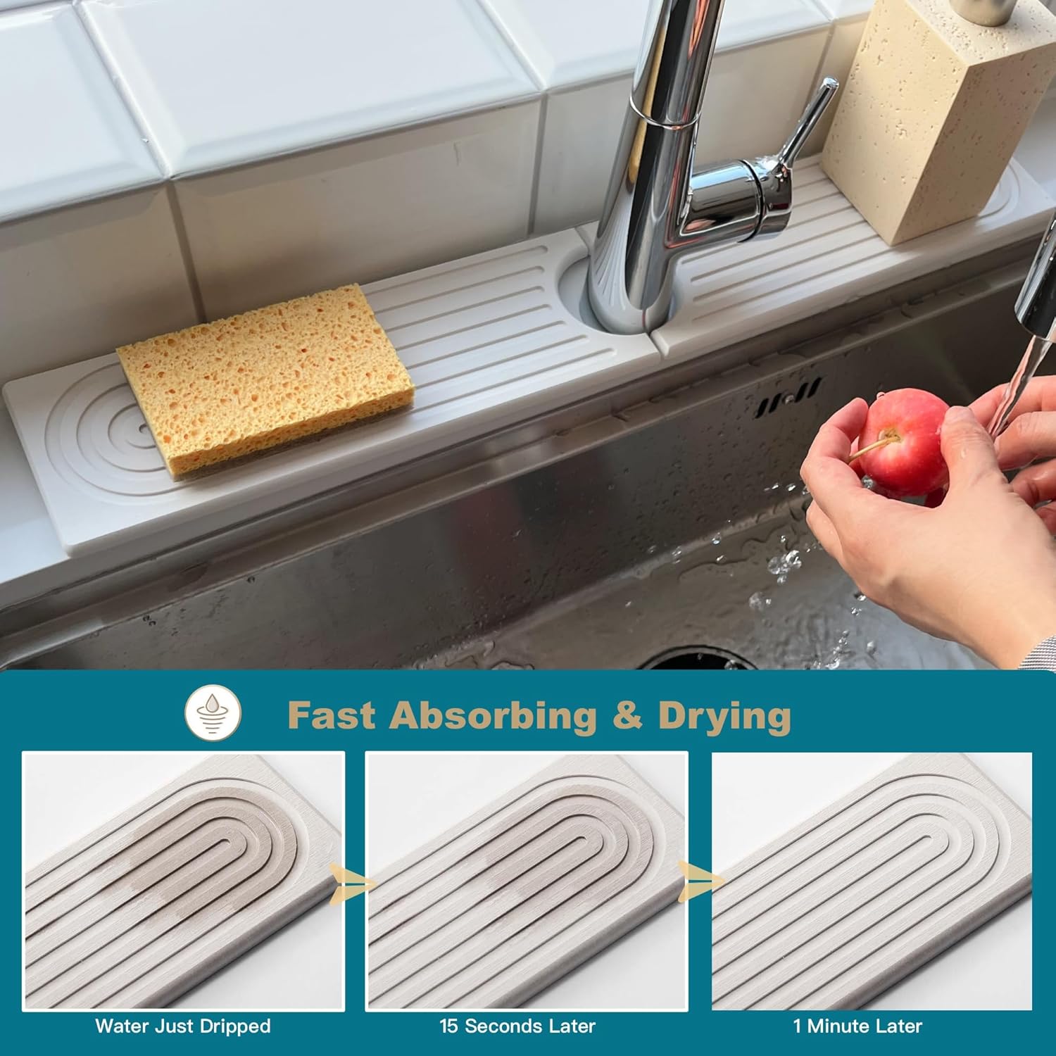 - Drying Fast: Our Faucet mat for kitchen sink is crafted from natural diatomacues earth. The diatomite stone's small holes enable amazing water absorption, quickly soaking up splashes and self-drying within minutes. Say goodbye to annoying drips and keep everything dry.