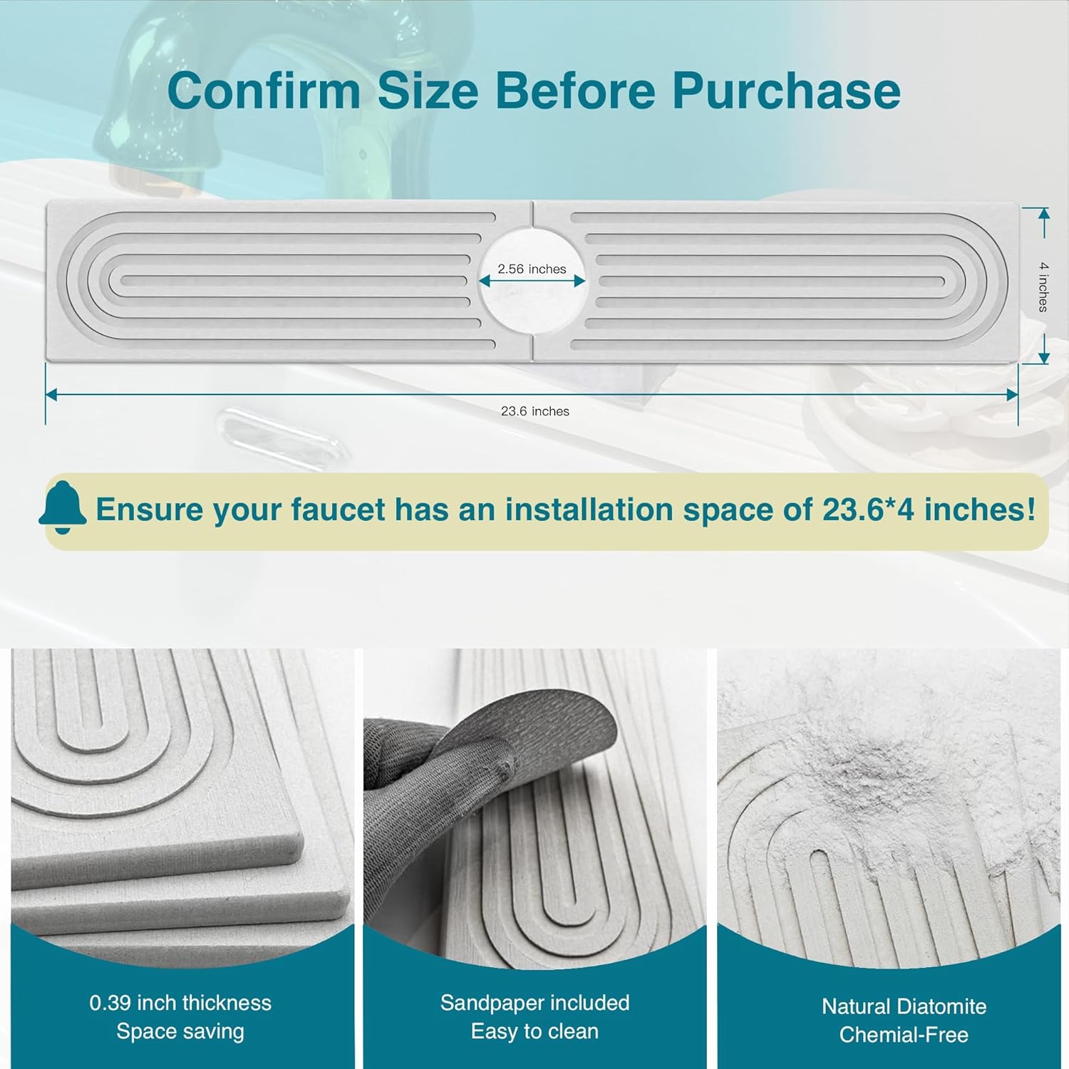 - Notice: Based on the product size, make sure the stone won’t cover any sink buttons or dispensers; Faucet-to-wall distance must be over 0.72"; Faucet base diameter must be under 2.5". | Size: 23.6" x 4" x 0.4", with a 2.56" center hole. NON-CUTTABLE HARD STONE MAT.