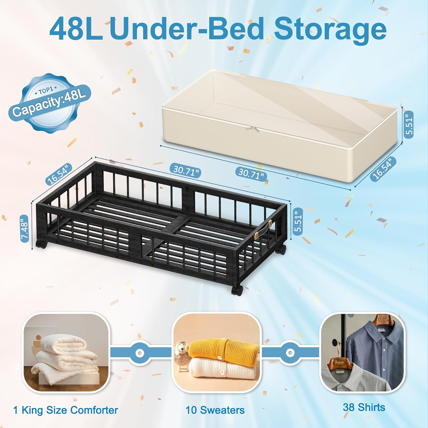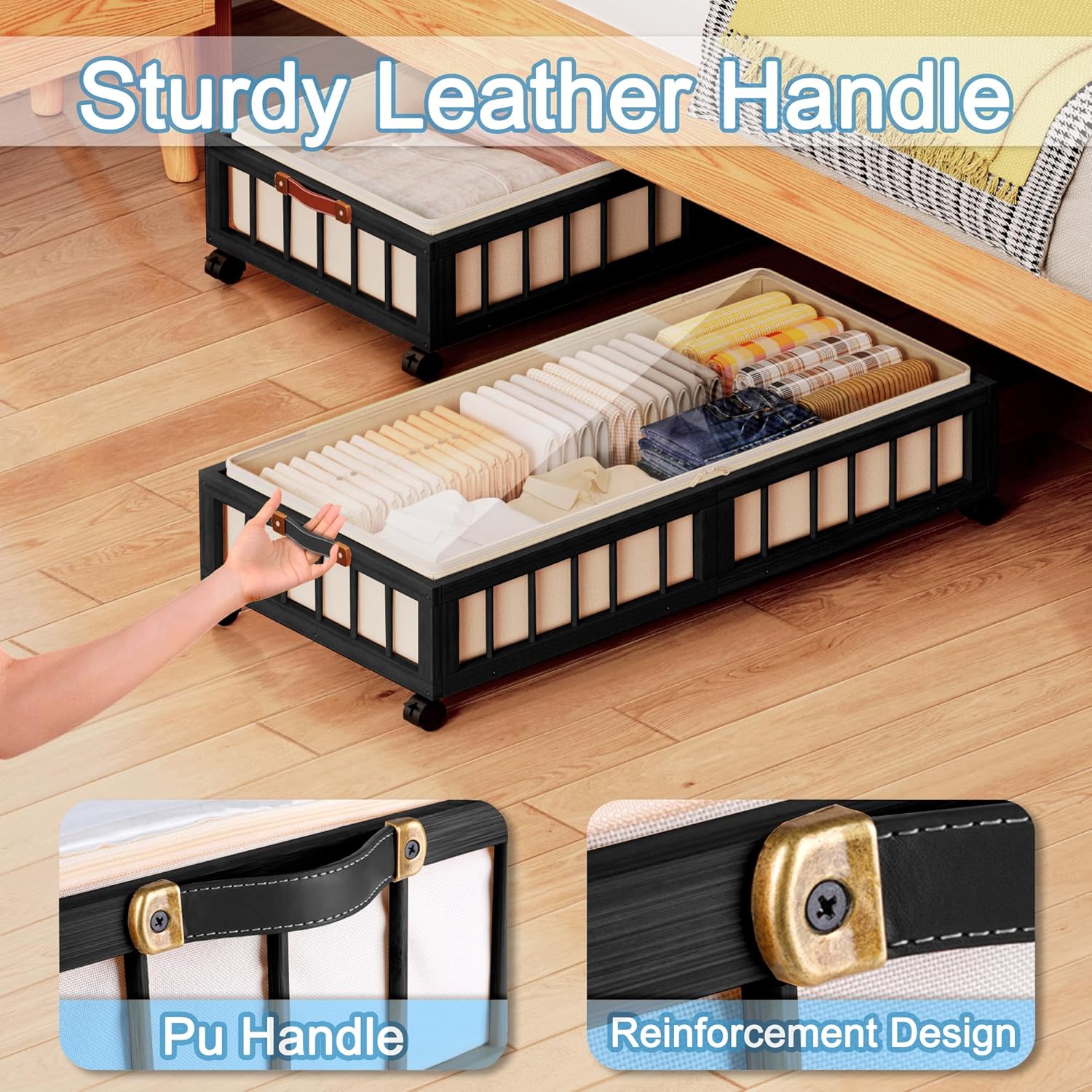 efluky 2-Pack Bamboo Under Bed Storage with Wheels, Rolling UnderBed Storage Basket with Large Dust Bag, Under Bed Storage Containers for Bedroom, Dorm and Basement, Black