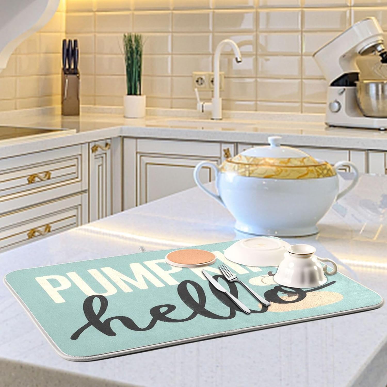 Hello Pumpkin Turquoise Fall Dish Drying Mat for Kitchen Countertop 16x18 Aqua Teal Autumn Small Drying Mat Reusable Quick Dry Dish Sink Mats Easy Clean Decorative Essentials