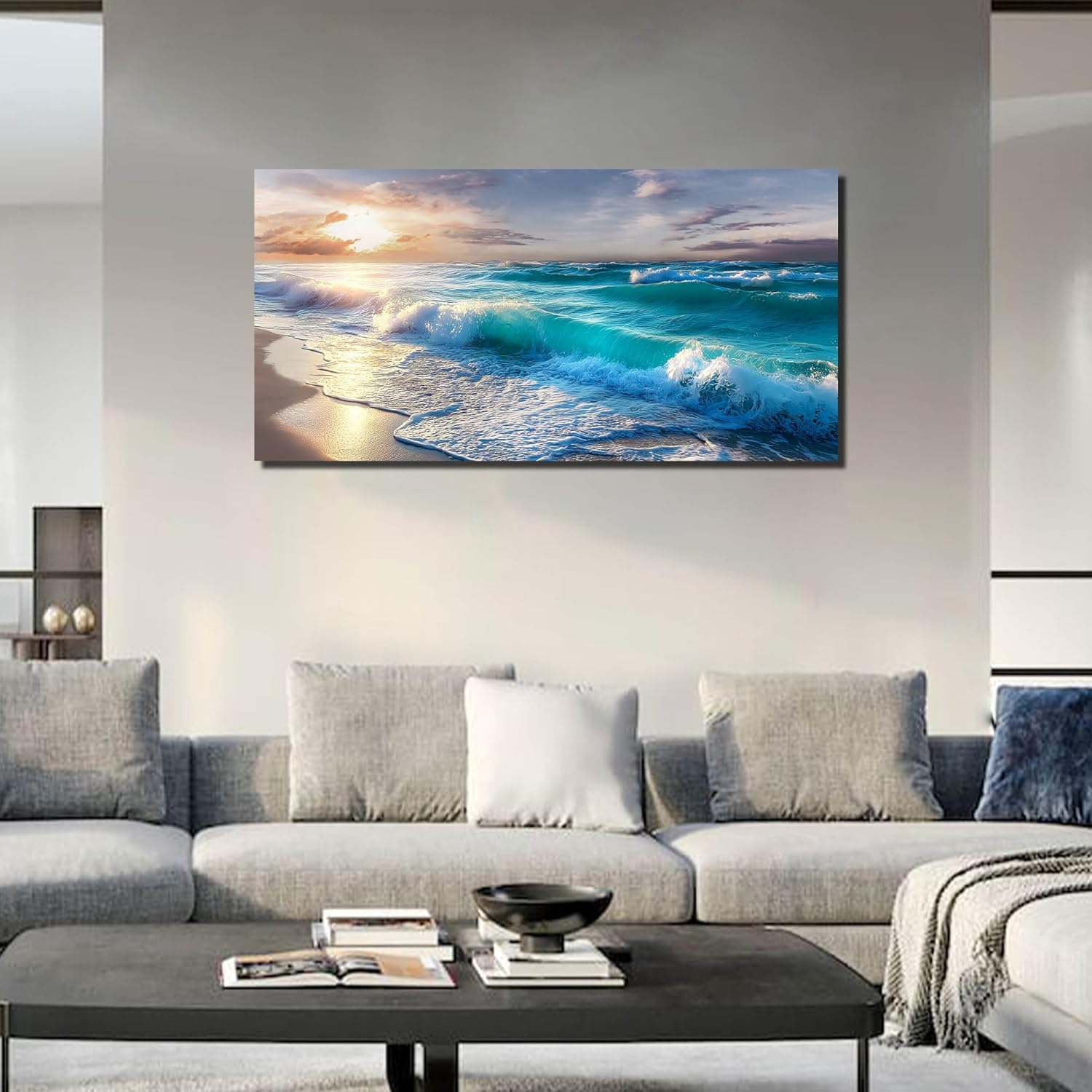 GUGIKA Ocean Wall Art for Living Room, Blue Wave and Large Coastal Beach Canvas Wall-Decor for Bedroom, Gold Sun Scenery Pictures for Hallway Office, Size 48 x 24 Inches