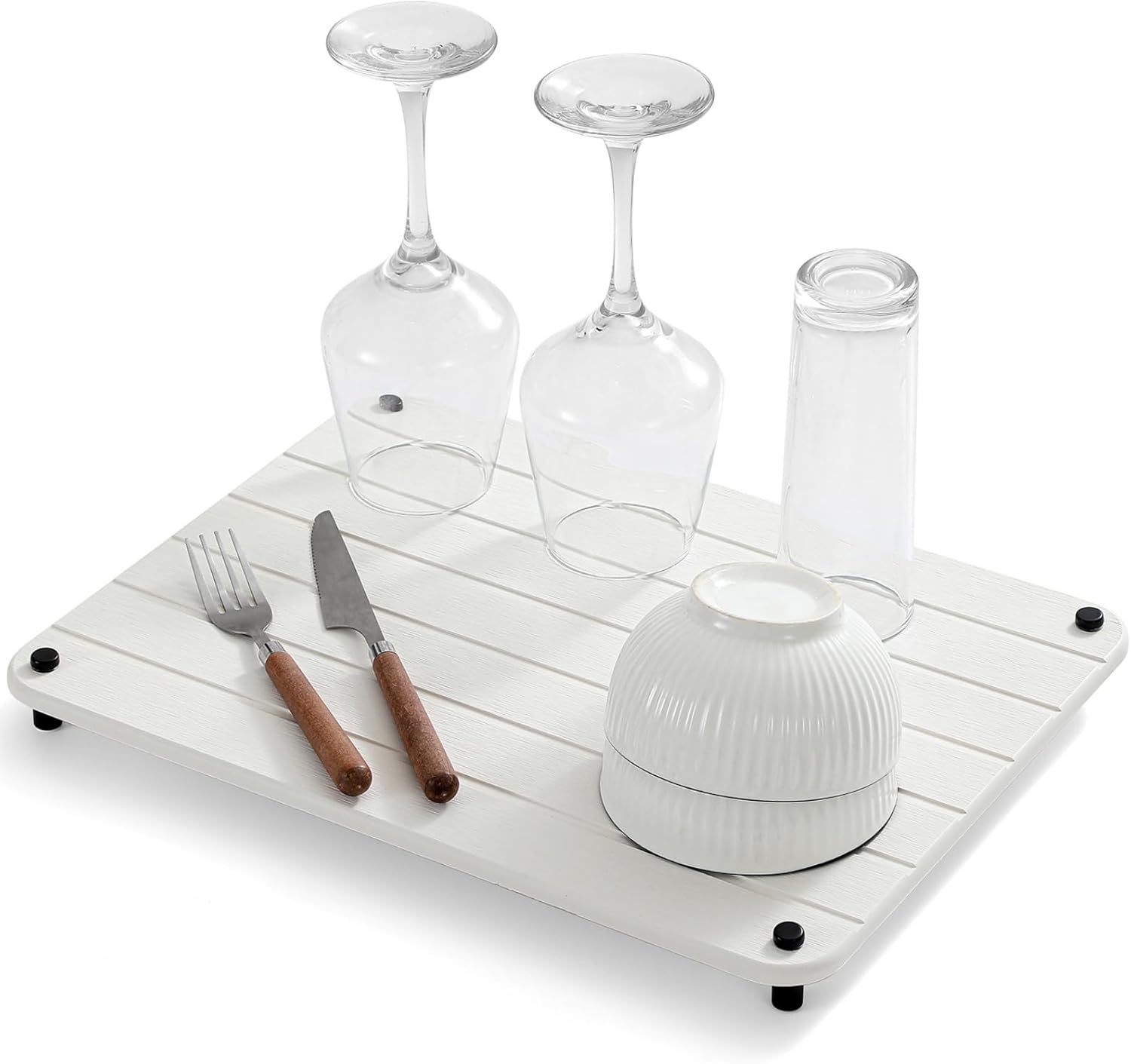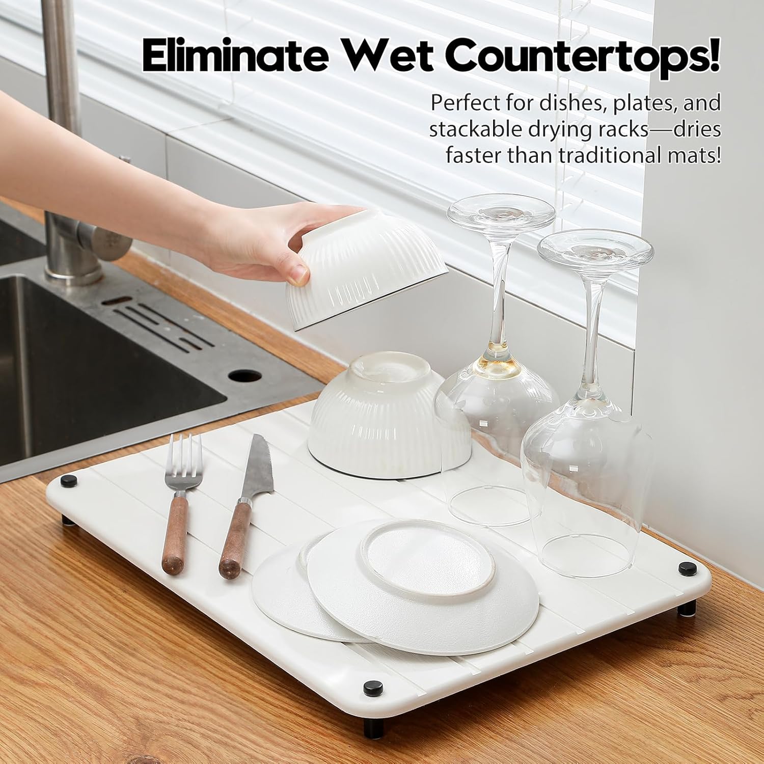 Stone Dish Drying Mat for Kitchen Counter, Water Absorbing Bathroom Tray Sink Organizer, Diatomaceous Earth Countertop Dish Rack Riser Sponge Holder Soap Dish, White, 16" x 12"