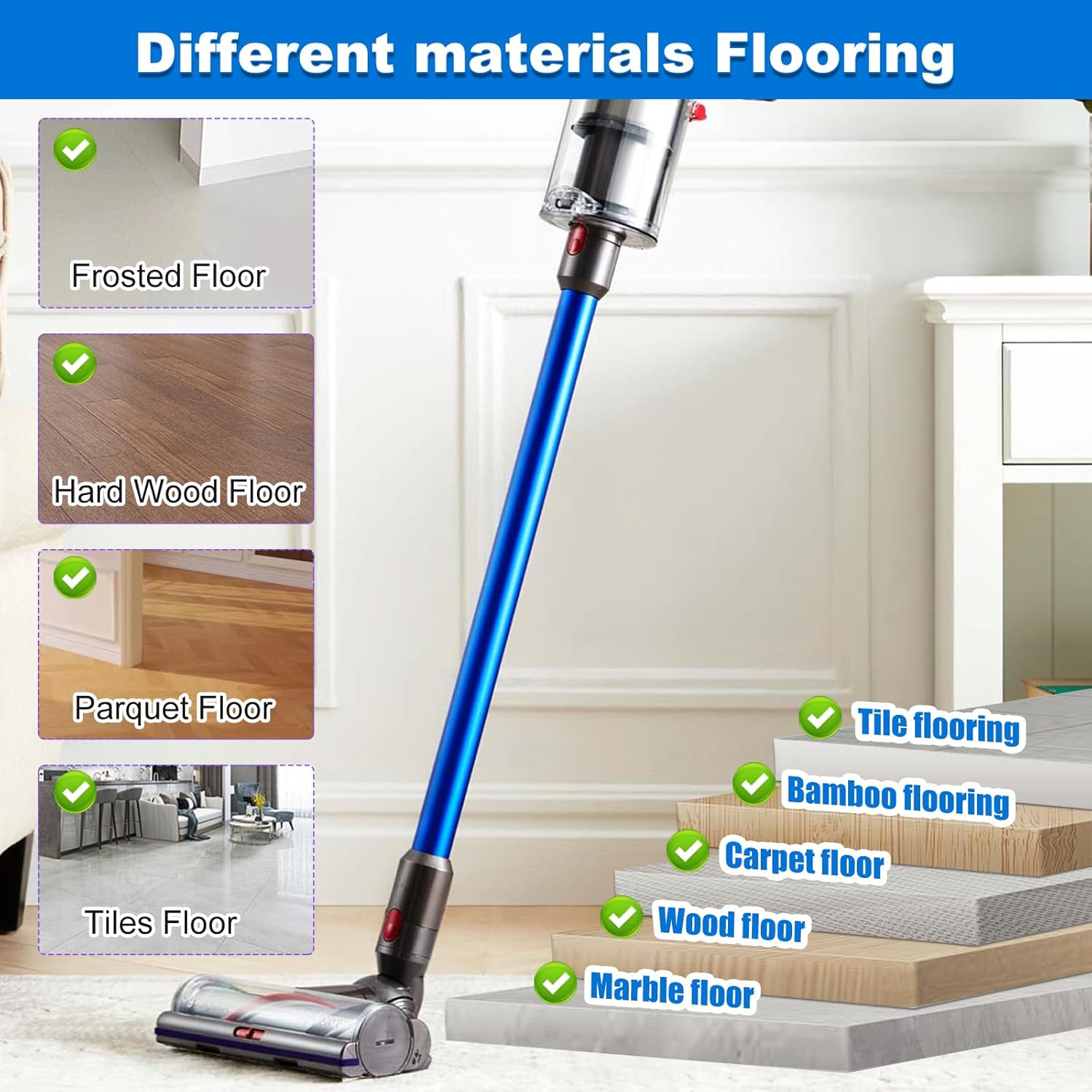 - 【Adjust Suction Control – Suitable for Any Floor】This V8 vacuum head for Dyson features intelligent suction control: Slide the '+/-' switch to adjust power. "+" mode delivers max suction for ground-in dirt & high-pile rugs while "-" mode provides gentle cleaning for delicate floors.