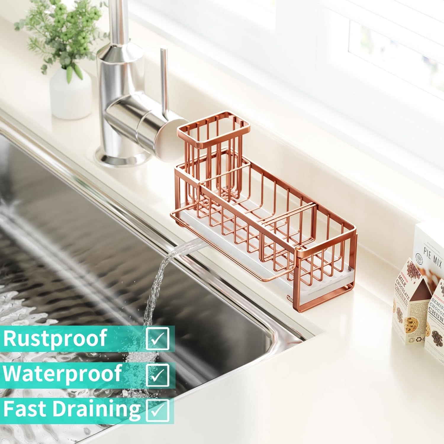 HapiRm Sponge Holder for Kitchen Sink - Self-draining Sink Caddy with Brush and Dishcloth Holders, Stainless Steel Kitchen Organizer for Countertop - Rose Gold