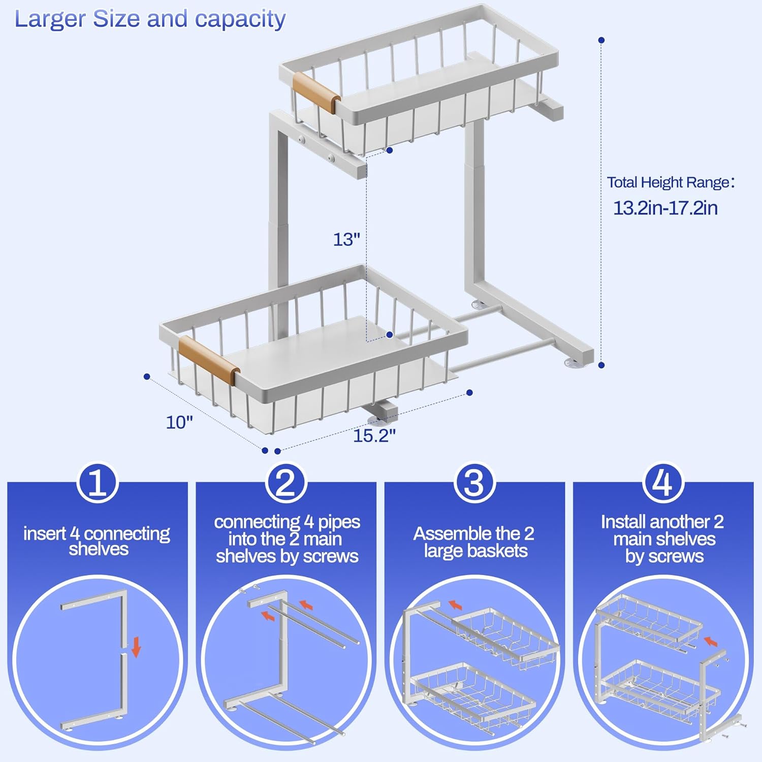 - 【Dimensions】15.2"L x 10"W x 13.2'' - 17.2''H. To fit most of the under-sink room, the total height of this Under Sink Organizer can be adjusted from 13.2 inches to 17.2 inches. Please measure your under-sink room before purchase to avoid unnecessary return.