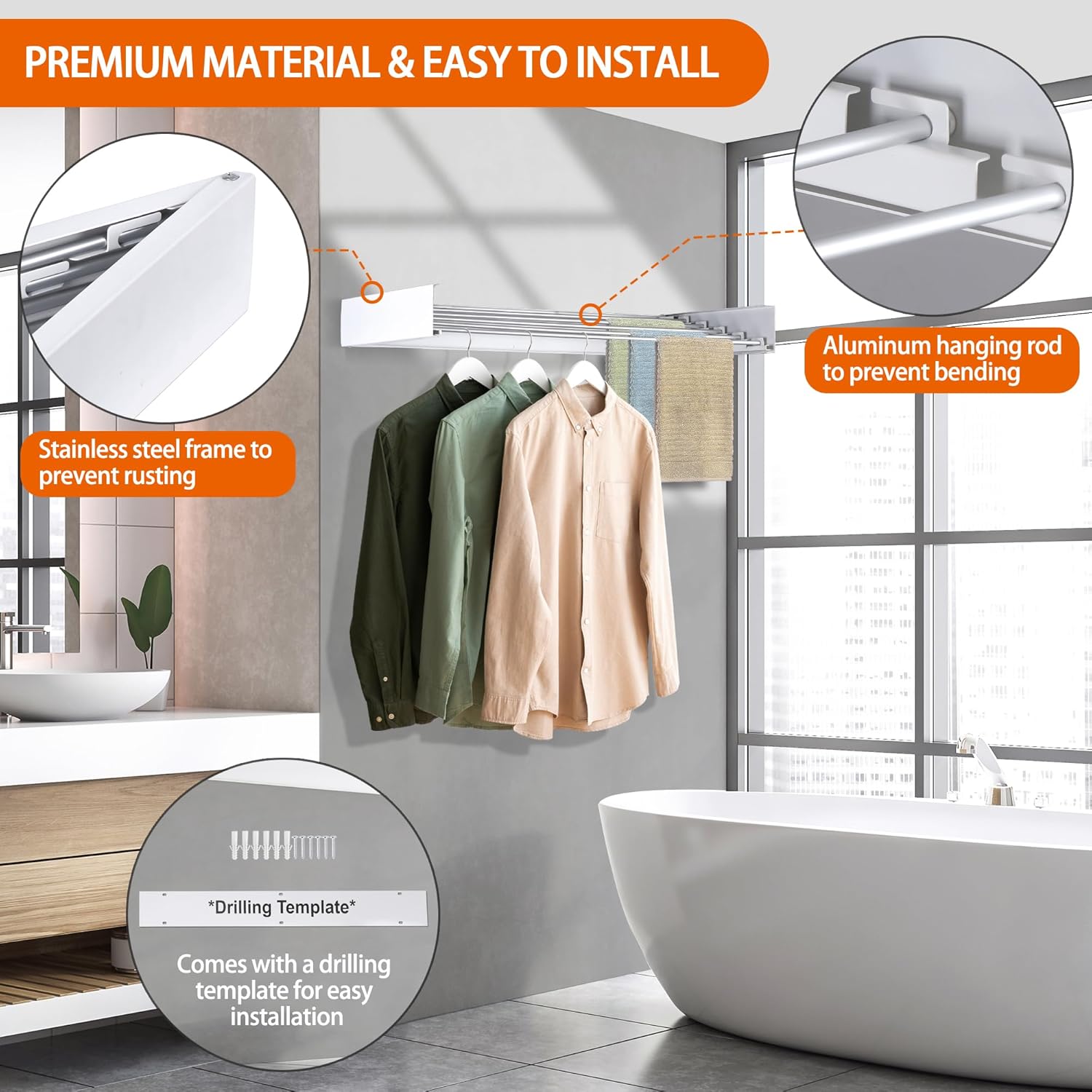 FOCHIER F Laundry Drying Rack Wall Mounted Clothes Drying Rack Collapsible with 4 Aluminum Rods and Drilling Template Long Screwdriver Bit 60 lbs Capacity (White, 40")