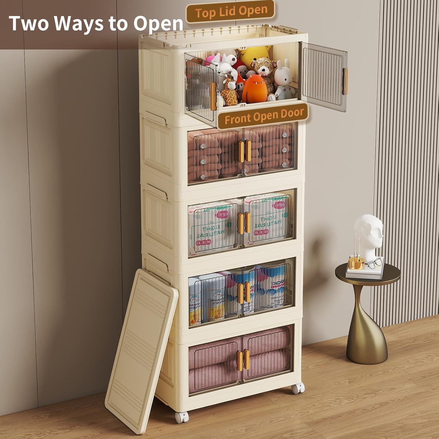 - Stackable & Removable Design: Foldable storage bins and a stackable storage box. Each level has matching grooves and clasps on the top sides to lock the storage bins securely, and the foldable design maximizes space in your home when not in use. There are five rotating wheels on the bottom for easy movement