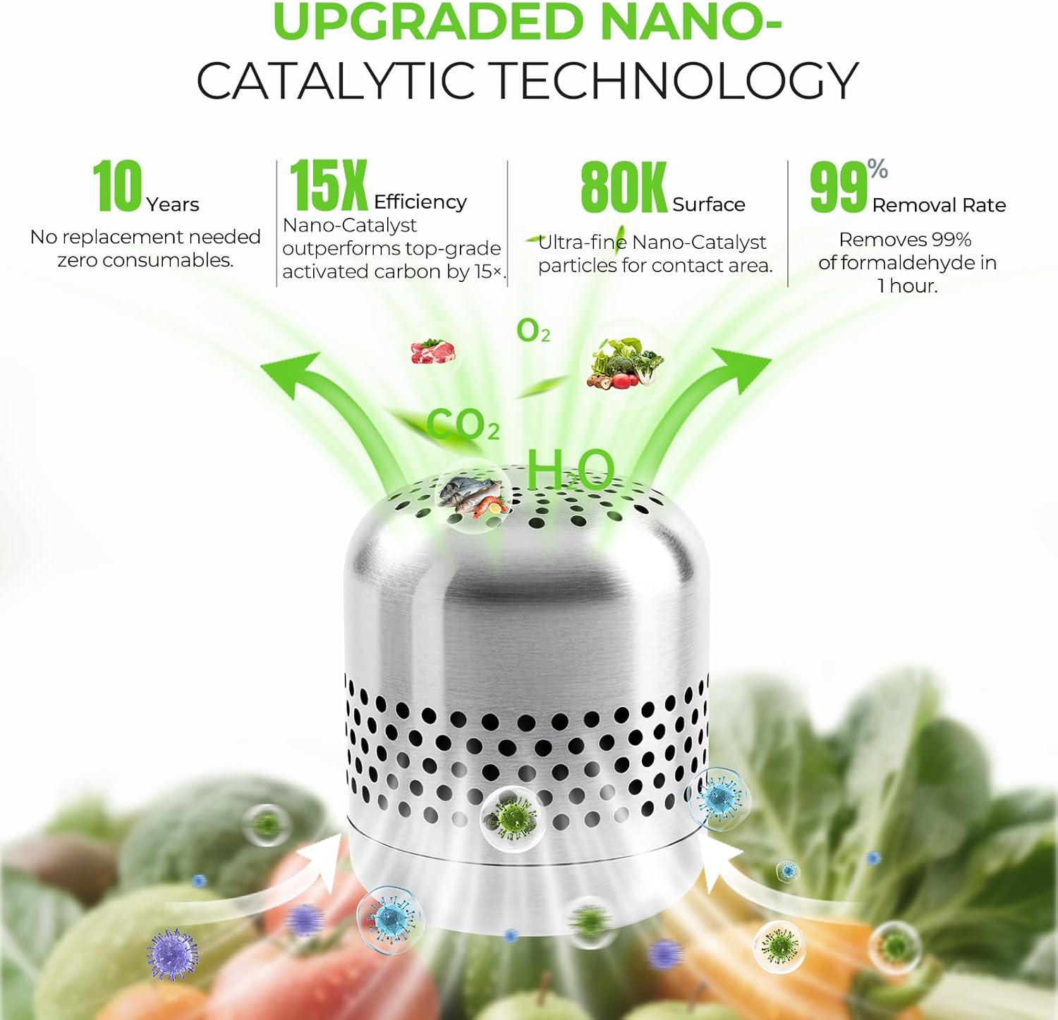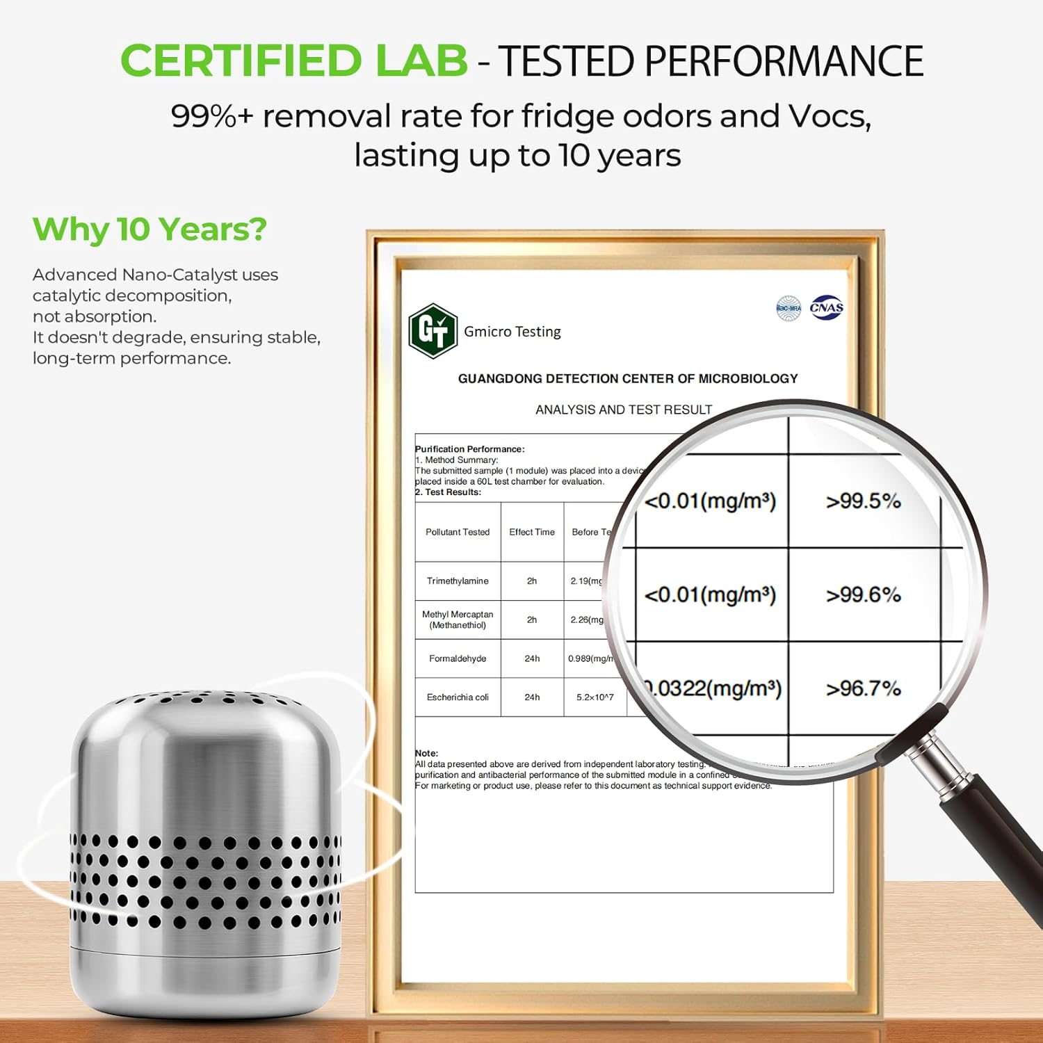 - 𝐀𝐝𝐯𝐚𝐧𝐜𝐞𝐝 𝐍𝐚𝐧𝐨-𝐂𝐚𝐭𝐚𝐥𝐲𝐭𝐢𝐜 - No more lingering fridge odors. Our refrigerator deodorizer features an advanced composite nano-catalyst that breaks down harmful VOCs—like formaldehyde, benzene, and toluene—into harmless substances.