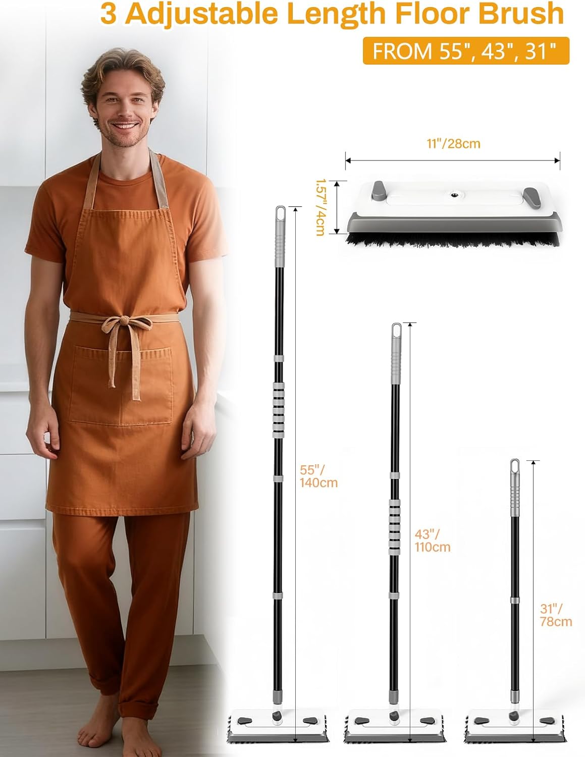 - 【3-in-1 Multi-Purpose Cleaning Brush】 Say goodbye to storing multiple tools. This all-in-one floor scrub brush combines three solutions in one: a wide stiff bristle brush for large areas, a detachable V-brush for corners, and a built-in squeegee broom for a clean, streak-free finish. One tool replaces many—saving space and effort.