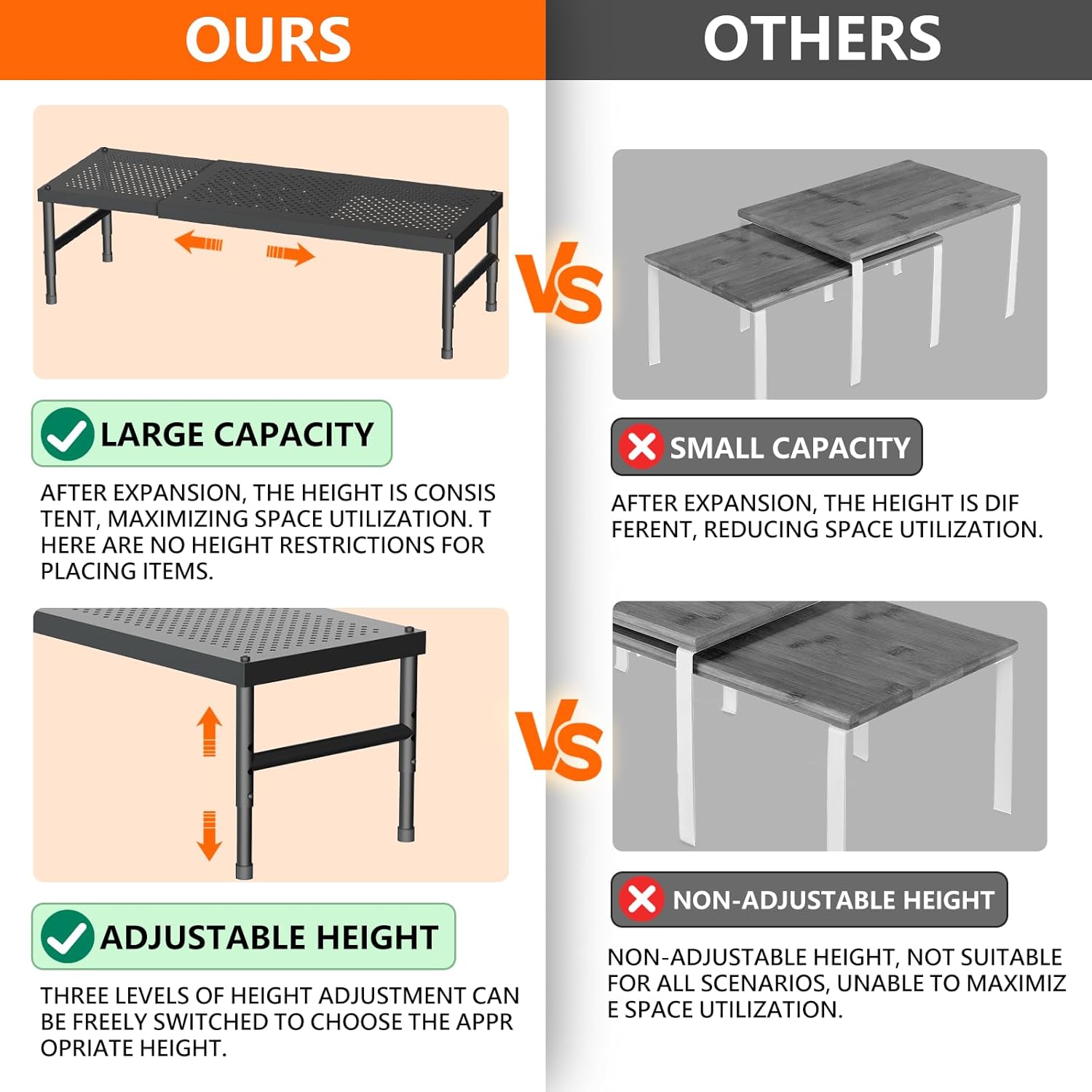 - Adjustable Design:The length of the cabinet shelf organiser can be adjusted as needed, with an extendable range of 16.4-28.35 inches (41.7-72cm), adjustable heights are 5.5 inches (14cm), 6.3 inches (16cm), 7.08 inches (18cm).These shelf organizers can be stacked on top of one another, nested, used separately, or even in an L-shape. Adjust them how you want to perfectly fit your kitchen space