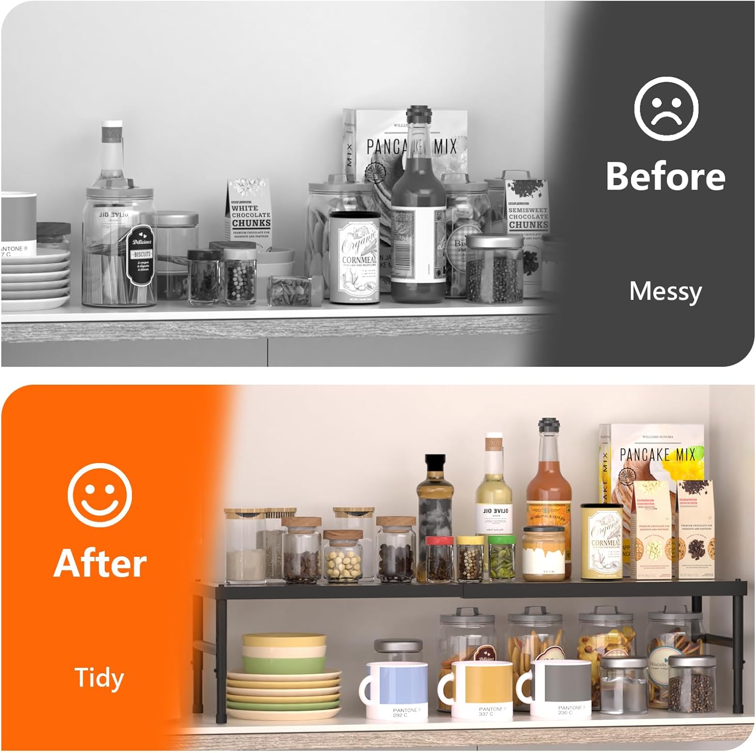 - Expandable & Stackable Cabinet Organizer:Designed as a top-tier kitchen organizers and storage solution, this product includes an adjustable pantry shelves system that allows for customization to hold various items securely, coupled with an expandable cabinet shelf that adapts to your needs, serving as an excellent spice rack organizer for cabinet and improving overall cupboard shelf organize capabilities for a tidy kitchen.