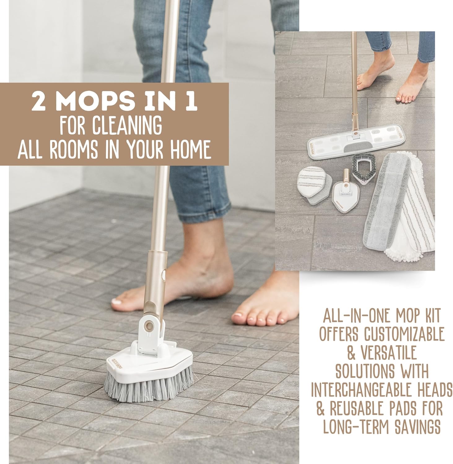 - Complete Floor Cleaning System: What’s Included – Mop with Extra Wide Mop Head with Scouring Pad, Microfiber Multi-Action Wet + Dry Cleaning Pad, Microfiber Multi-Action Clean + Dust Pad, Microfiber Multi-Action Clean + Polish Pad, Interchangeable Triangular Mop Head, Triangular Multi-Action Scrub Brush, Triangular Multi-Action Cleaning Pad, Triangular Multi-Action Scouring Pad, Cleaning Spade and 16oz Quick Shine Multi-Surface Floor Cleaner and Floor Finish