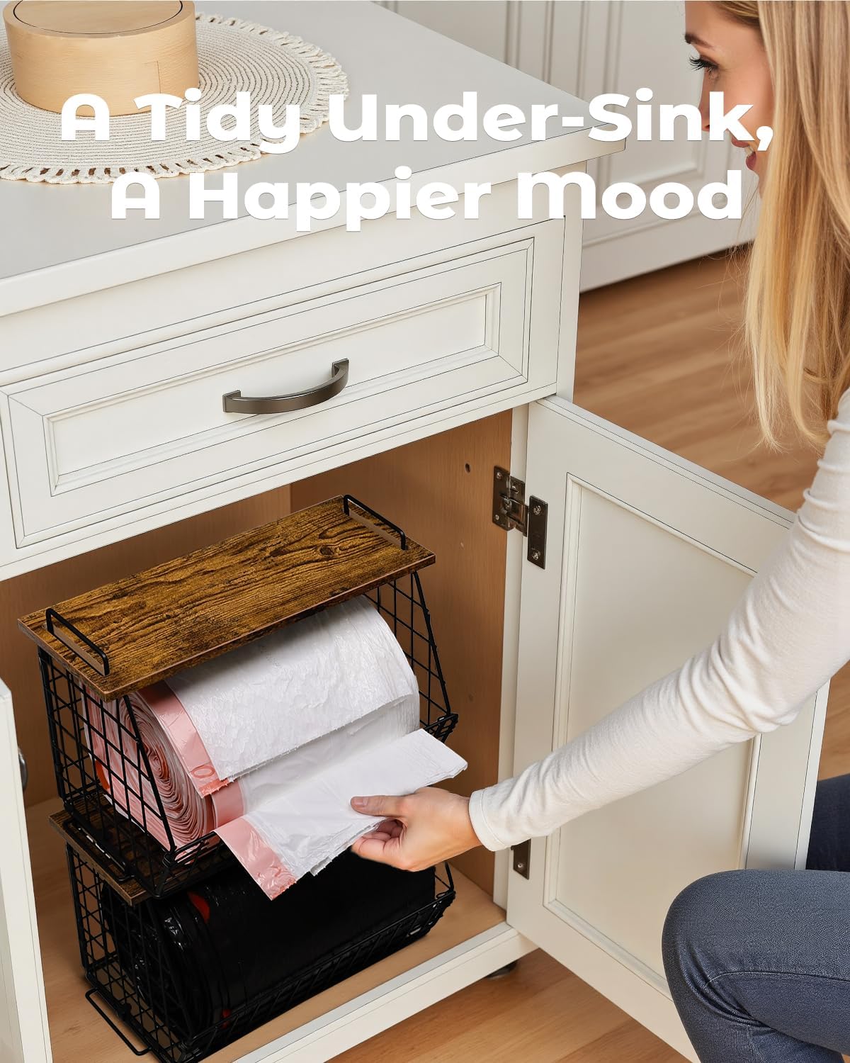 2 Pack Stackable Extra Large Trash Bag Holder Under Sink, Wall Mounted Garbage Bag Dispenser Roll Holder for 13/33 Gallon Trash Bags, Kitchen/Pantry/Laundry Room Organization Basket Storage Bin