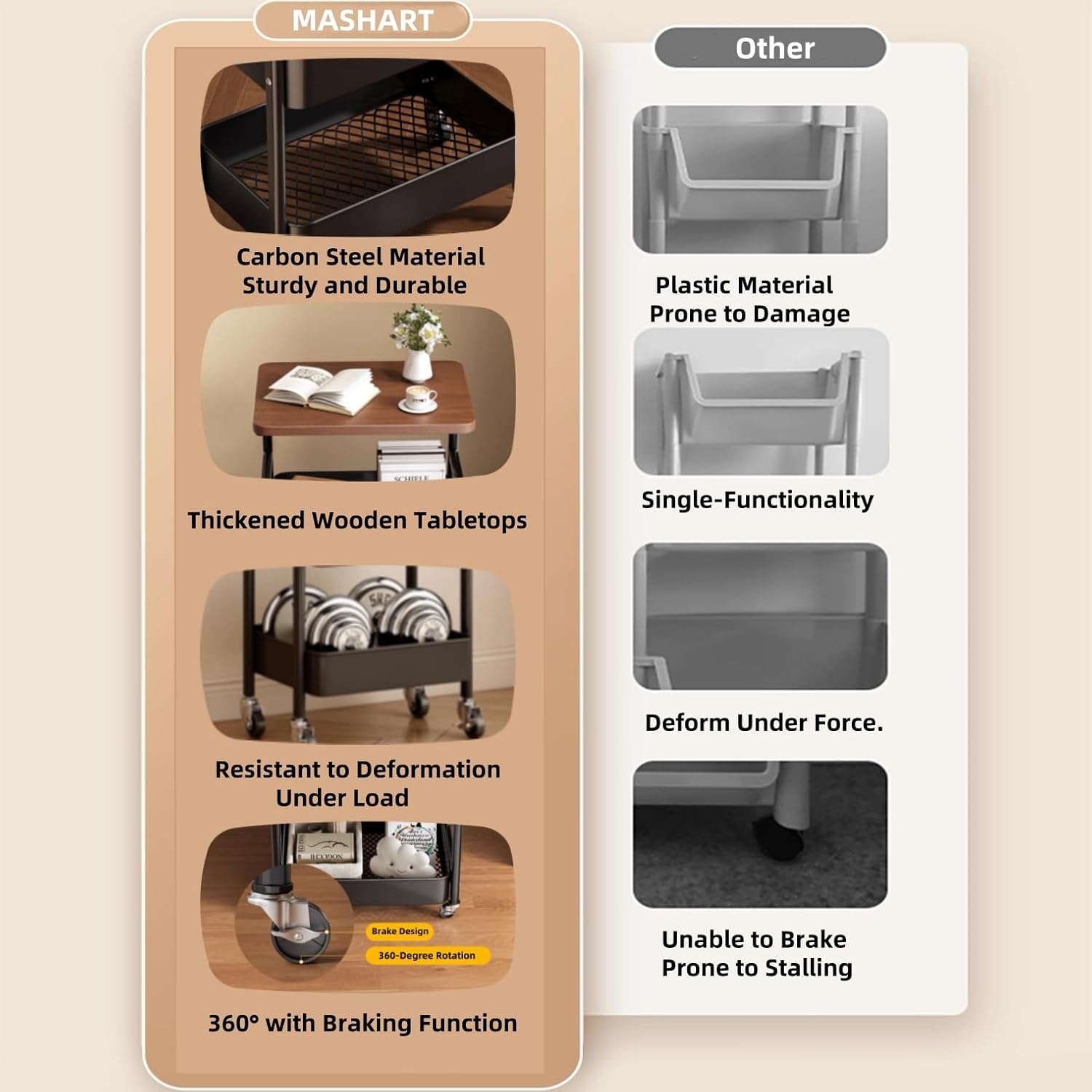 3 Tier Metal Rolling Utility Cart Organizer with Walnut Table Top, Stable and Sturdy Rolling Storage Carts with 2 Lockable Wheels for Kitchen,Bathroom,Snacks,Coffee,Craft,Makeup,Baby Essentials