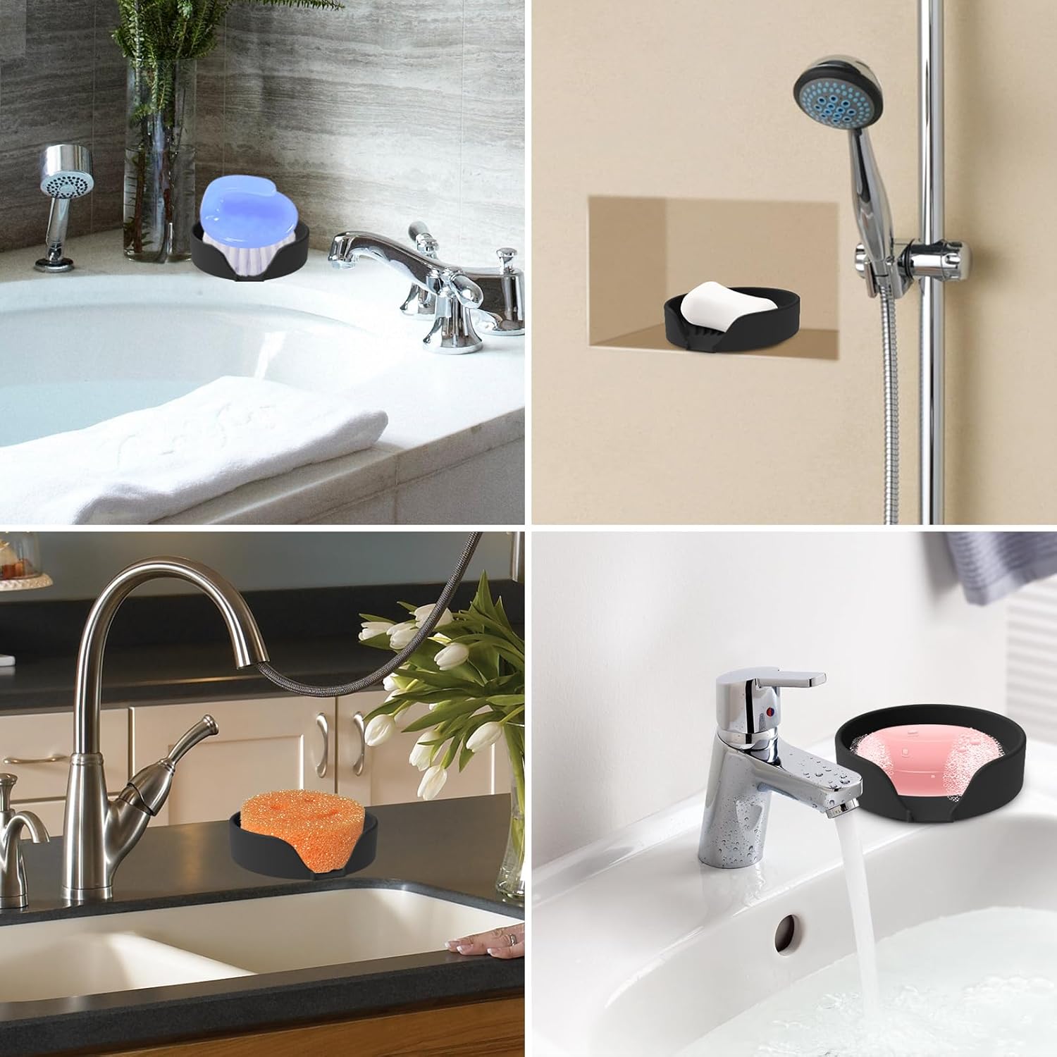 Self Draining Soap Dish, Silicone Suction Cup Soap Holder Tray Savers Container Sponge Holder for Bar Bathroom Shower Kitchen Sink, Can Extend Soap Life (1, Black)