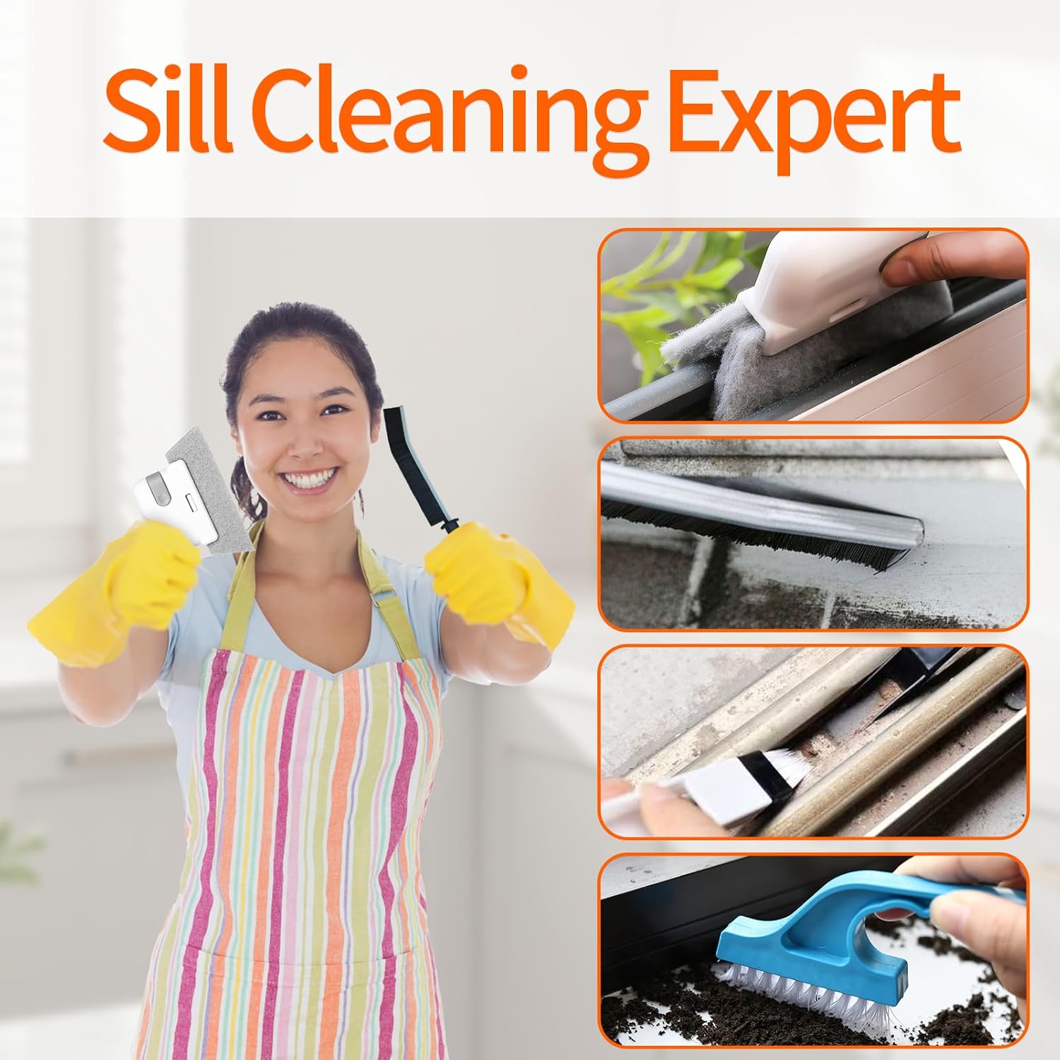 - 11PCS WINDOW CLEANING KIT - 11 specialized tools tackle every corner of your window door! Includes:3 Magic window cleaning toolswith 2 extra replaceable heads, 2 Gap brushesfor tight spaces, 1 Swan-shaped track brush with ergonomic grip and 2 small crevice brushes. Perfect for home: Window, door tracks, tile, floors, shutter, vents, and more!