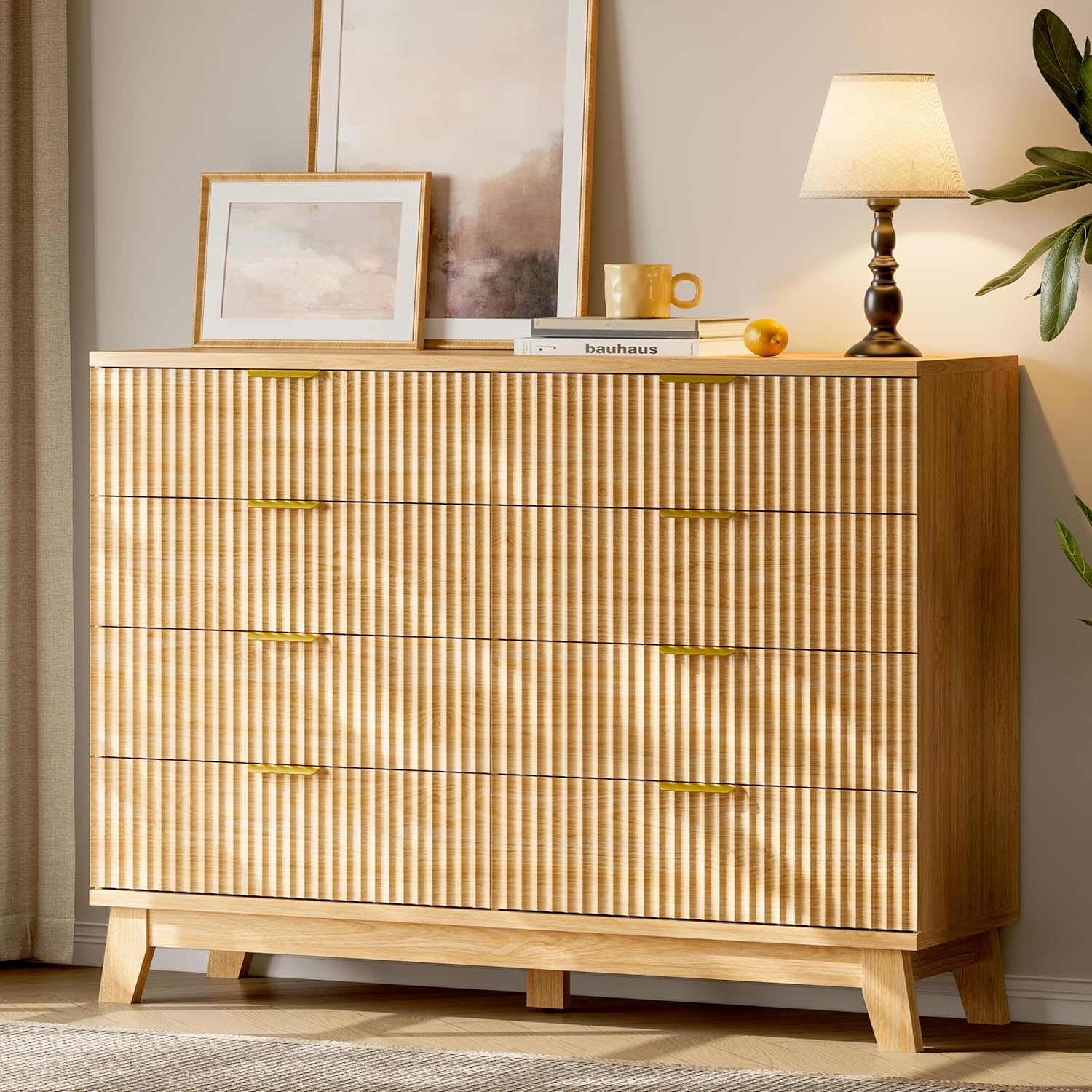 Fluted Dresser with 8 Drawers, 54" Wide Modern Chest of Drawers with Metal Handle, Wooden Dresser TV Stand, Wood Closet Clothes Storage Organizer for Bedroom, Living Room, Hallway, Natural Oak
