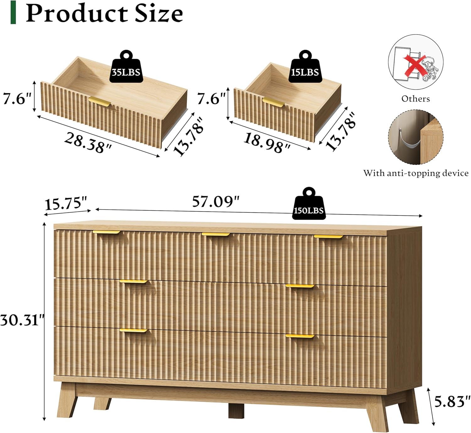 Fluted Dresser with 7 Drawers, 58" Wide Modern Chest of Drawers with Metal Handle, Wooden Dresser TV Stand, Wood Closet Clothes Storage Organizer for Bedroom, Living Room, Hallway, Natural Oak