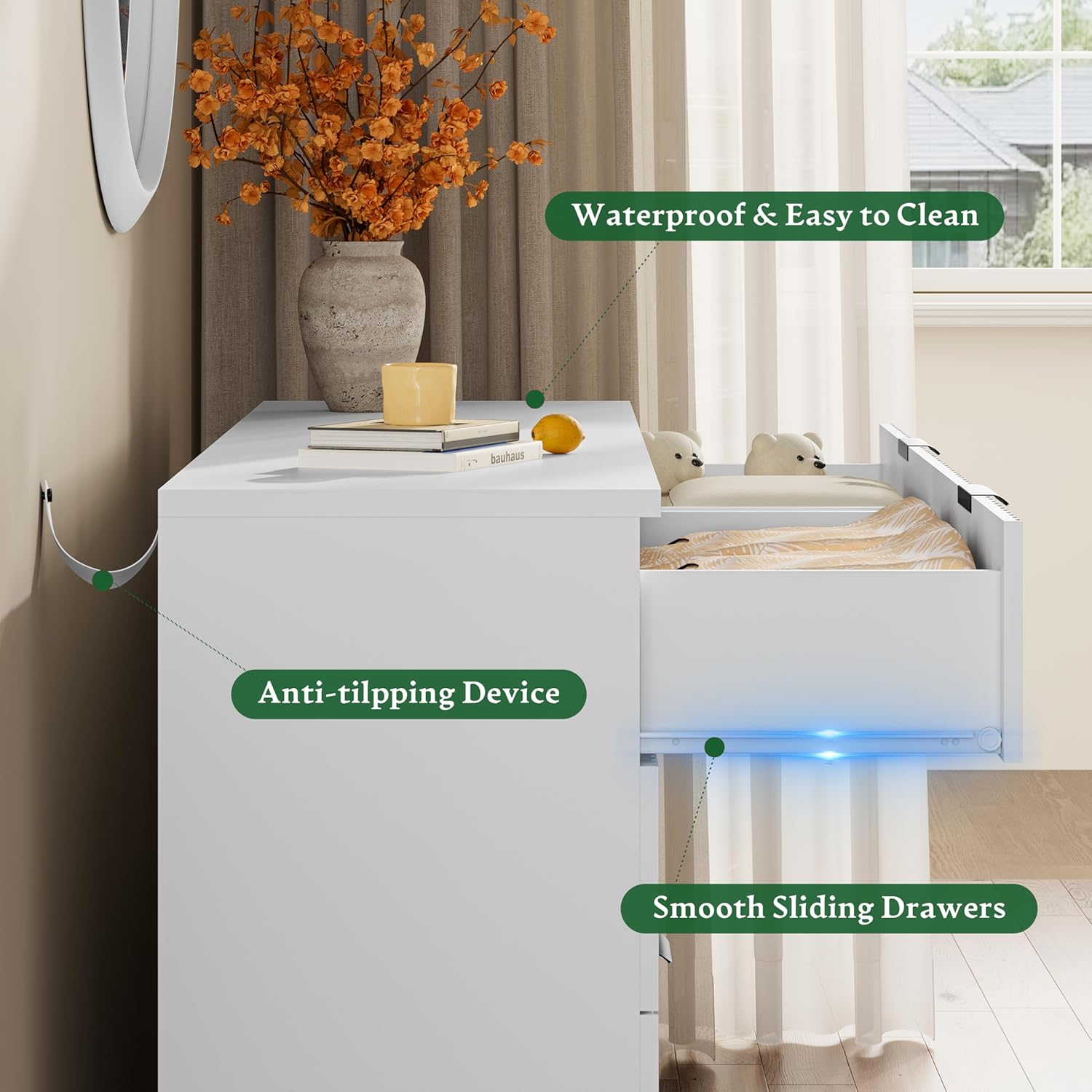 - 【Solid Material & Study Construction】The dressers & chests of drawers are constructed from optimal MDF, P2 engineered wood and coated metal handles which not only have exquisite texture, but also ensure long-term use and are scratch resistant. Each drawer holds up to 35 lbs and the thickened tabletop can support up to 150 lbs. For easy cleaning, just wipe with damp cloth and get it air-dried