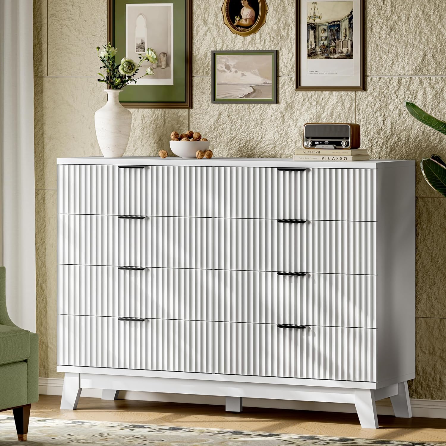 - 【Modern Chic Appearance】The unique wave-like fluted panel enhances the texture and elegance of this bedroom dresser. The thick table top features natural wood grain that complements the solid white finish. The wide metal handle and splayed base legs add a modern touch, creating a personalized and distinctive appearance
