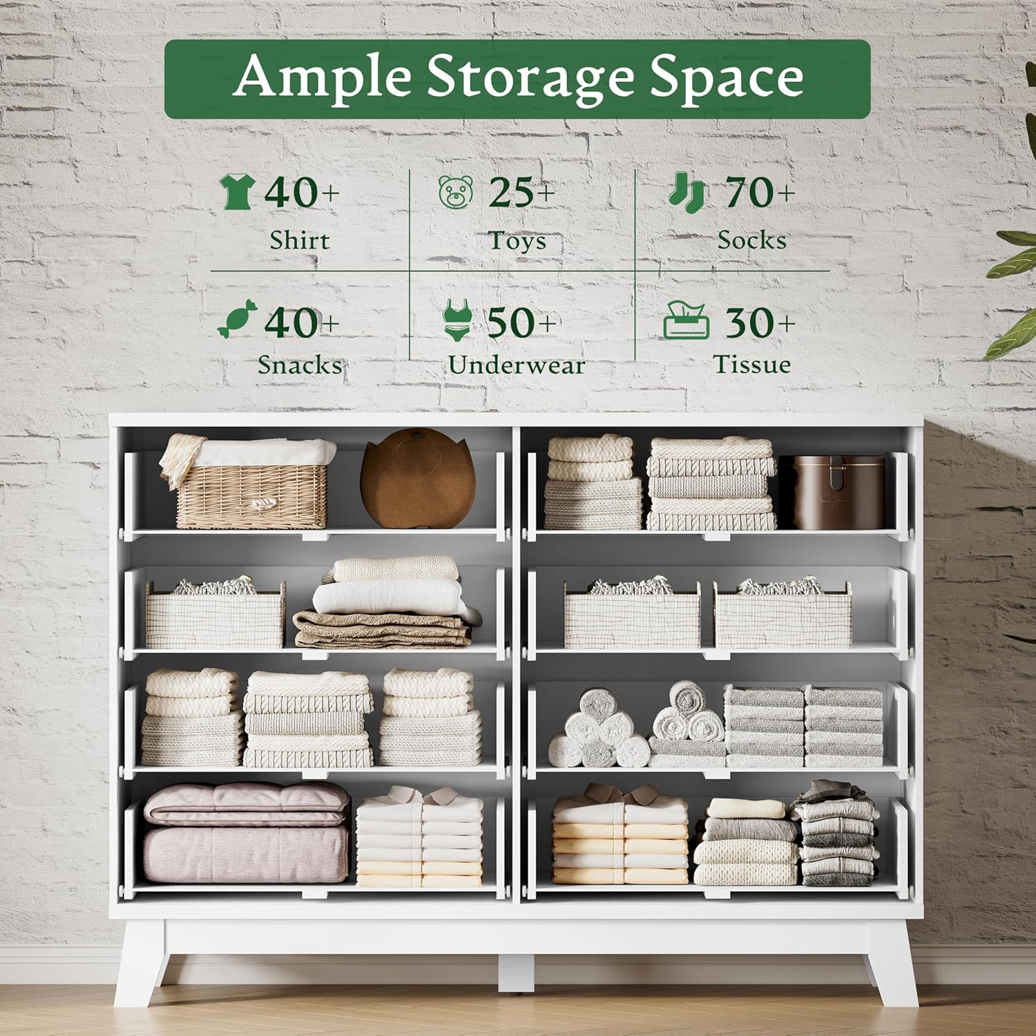 - 【Large Storage Capacity】The dresser for closet features 8 deep drawers that provide plenty of room for organizing clothing, bedding, cosmetics, or jewelry, helping you maintain a neat and tidy space. The wide wooden tabletop can serve as a dresser TV stand or display your decorations such as photo frames, plants or mirrors. Perfect for bedroom, living room, hallway, entryway