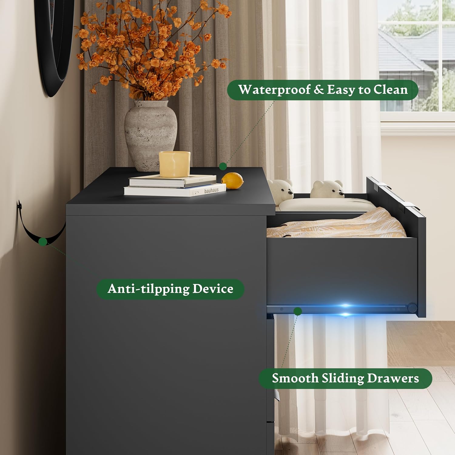 - 【Solid Material & Study Construction】The dressers & chests of drawers are constructed from optimal MDF, P2 engineered wood and coated metal handles which not only have exquisite texture, but also ensure long-term use and are scratch resistant. Each drawer holds up to 35 lbs and the thickened tabletop can support up to 150 lbs. For easy cleaning, just wipe with damp cloth and get it air-dried