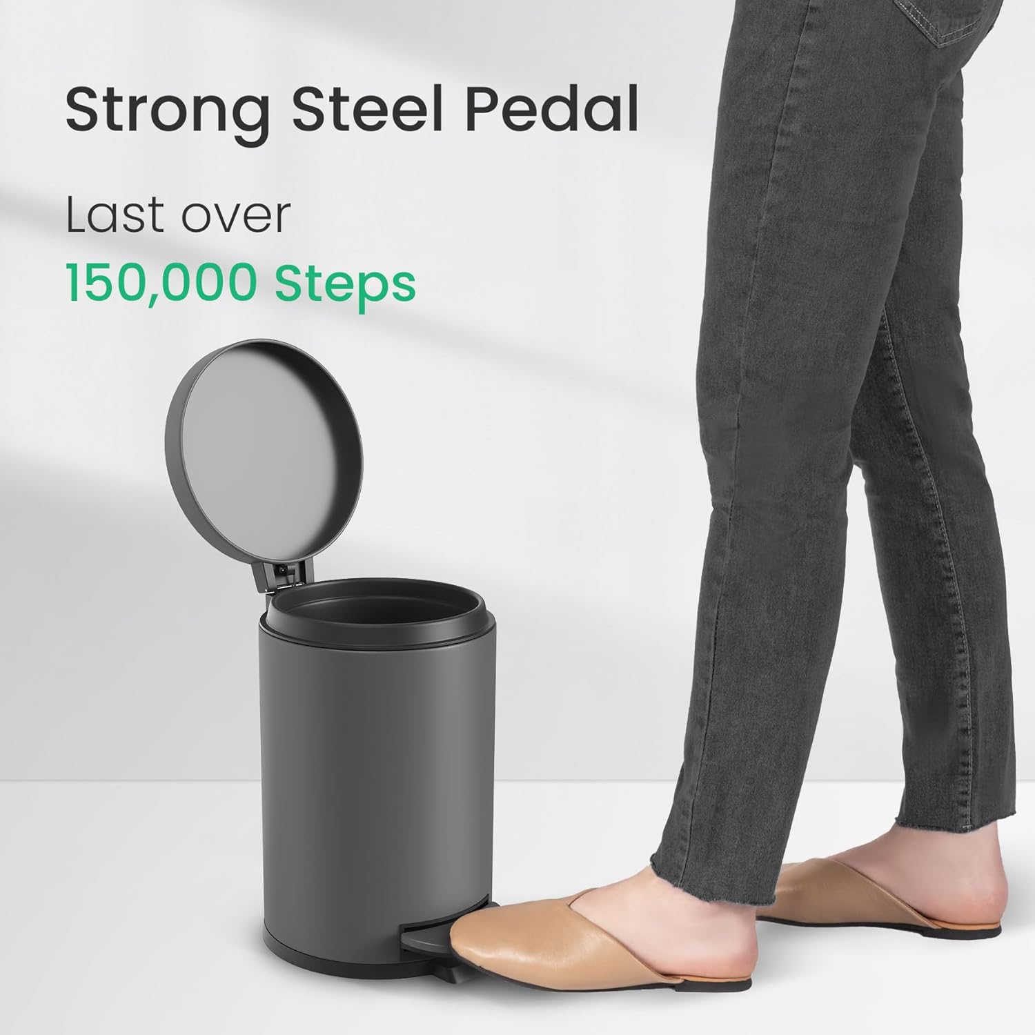 - Quality Construction: The trashcan is crafted from sturdy stainless steel. And the strong steel pedal is built to withstand over 100,000 steps — that's more than 20 steps a day for 20 years