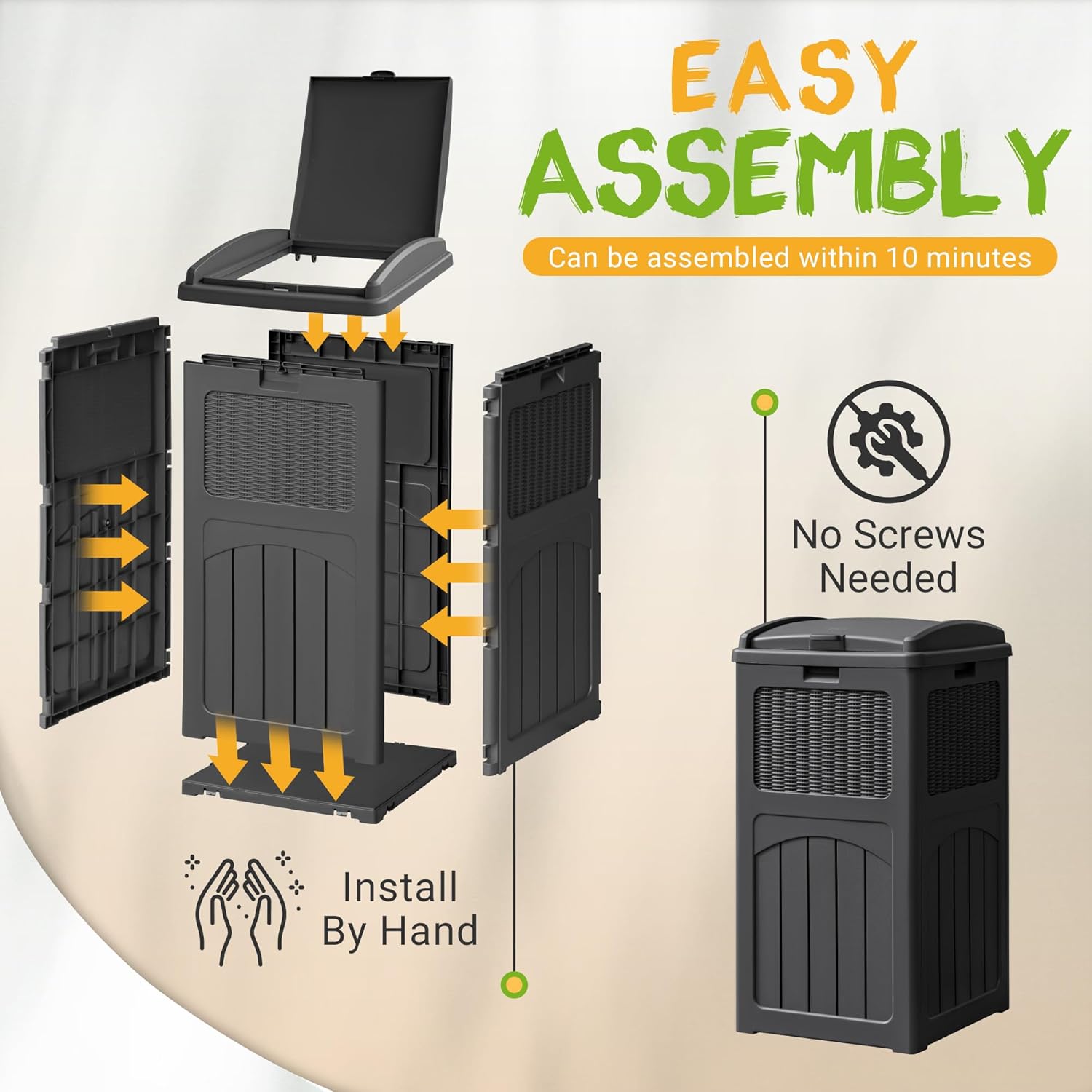 - Easy Assembly: The trash can comes in 4 parts. No screws needed, you can assemble it within 10 minutes by hand.
