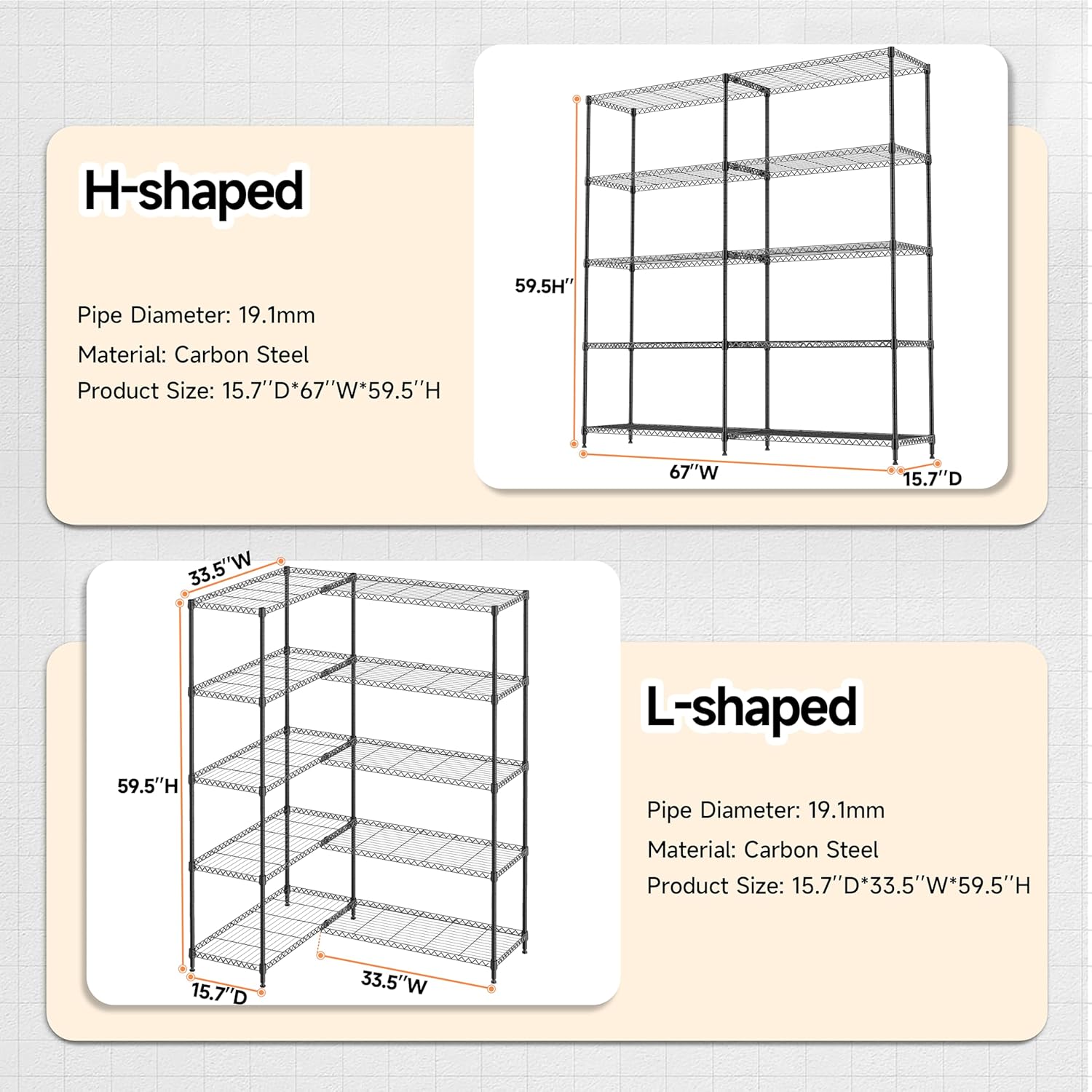 - MULTIPLE ASSEMBLY OPTIONS: This versatile metal shelving unit offers two assembly choices to maximize your space: a standard horizontal layout or a compact L-shaped design that fits perfectly into corners. Please note that the unit is a single, integrated structure and cannot be divided into two separate shelves