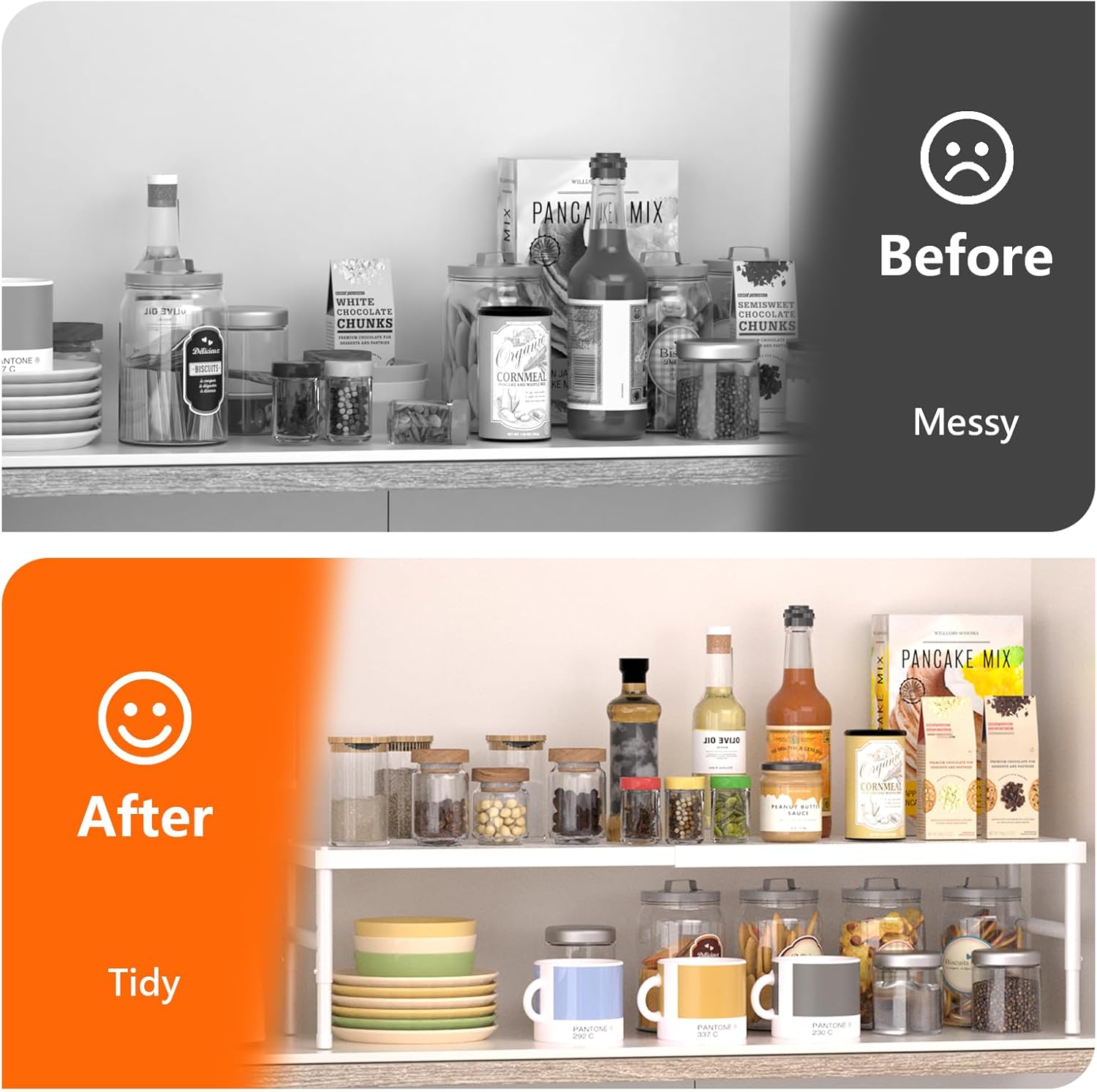 - Expandable & Stackable Cabinet Organizer:Designed as a top-tier kitchen organizers and storage solution, this product includes an adjustable pantry shelves system that allows for customization to hold various items securely, coupled with an expandable cabinet shelf that adapts to your needs, serving as an excellent spice rack organizer for cabinet and improving overall cupboard shelf organize capabilities for a tidy kitchen.