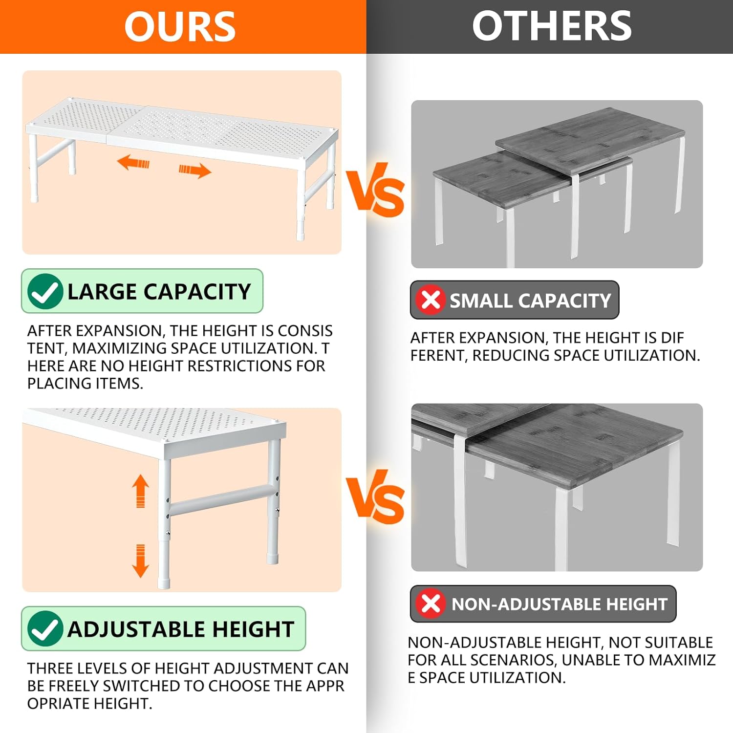 - Adjustable Design:The length of the cabinet shelf organiser can be adjusted as needed, with an extendable range of 16.4-28.35 inches (41.7-72cm), adjustable heights are 5.5 inches (14cm), 6.3 inches (16cm), 7.08 inches (18cm).These shelf organizers can be stacked on top of one another, nested, used separately, or even in an L-shape. Adjust them how you want to perfectly fit your kitchen space