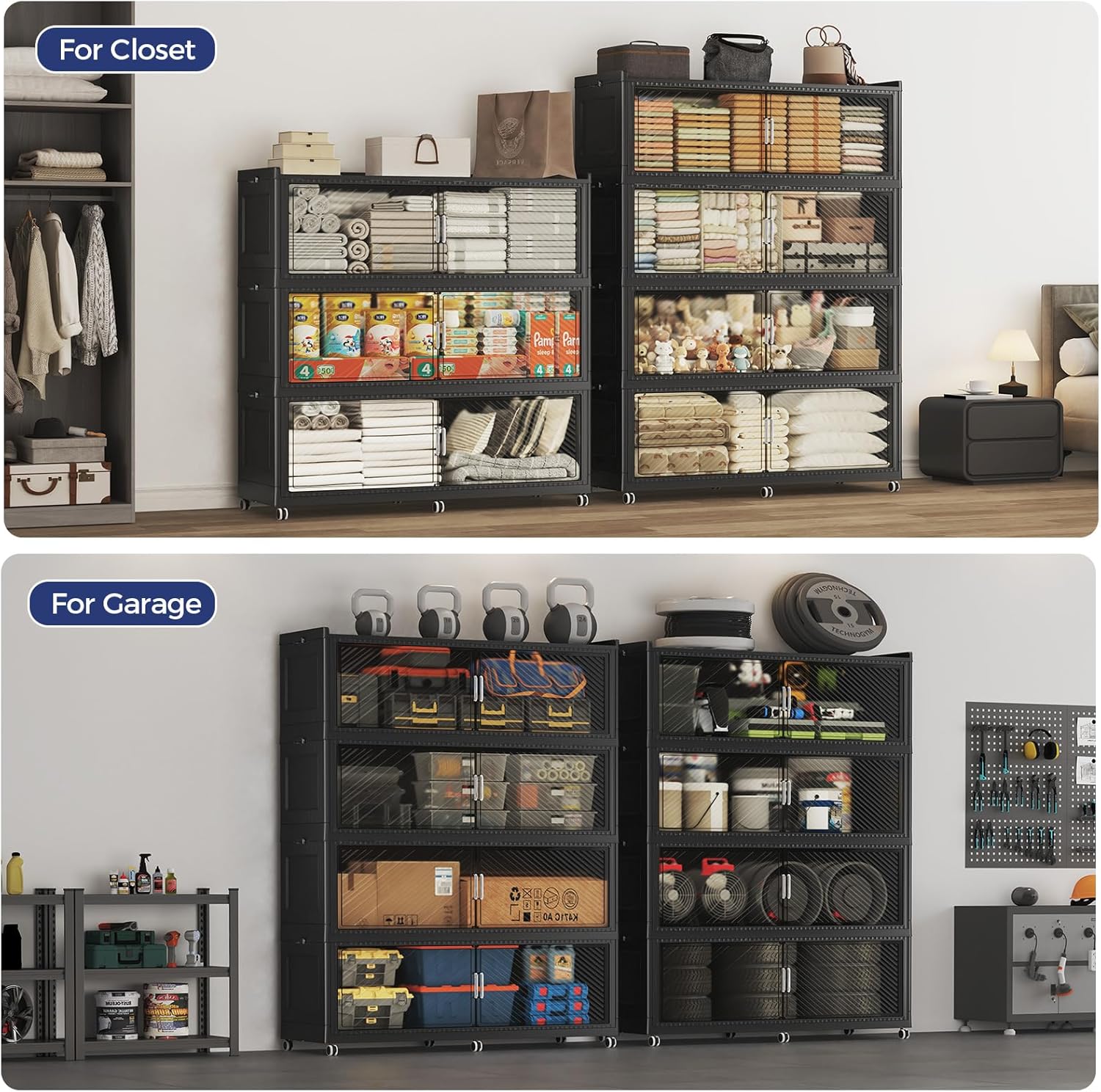 - 【8x Support Rods & 6x Rotating Wheels】Each 3-layer storage cabinet has 4x2 full metal support rods embedded in the bottom and lid. The more heavy-duty foldable storage bins can bear up to 180-220lb, far exceeding other fragile plastic folding storage bins. The wheeled storage bins design with 6x 360-degree rotating wheels, allowing for easy movement.WARNING : CHOKING HAZARD-small parts. Not for children under 36 moths.