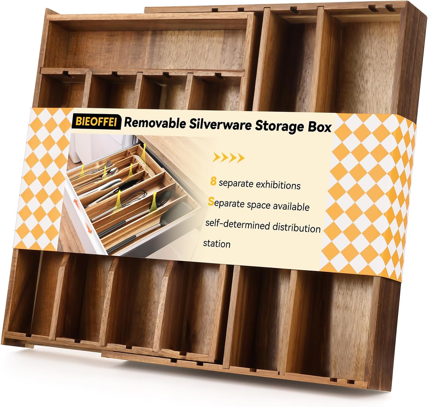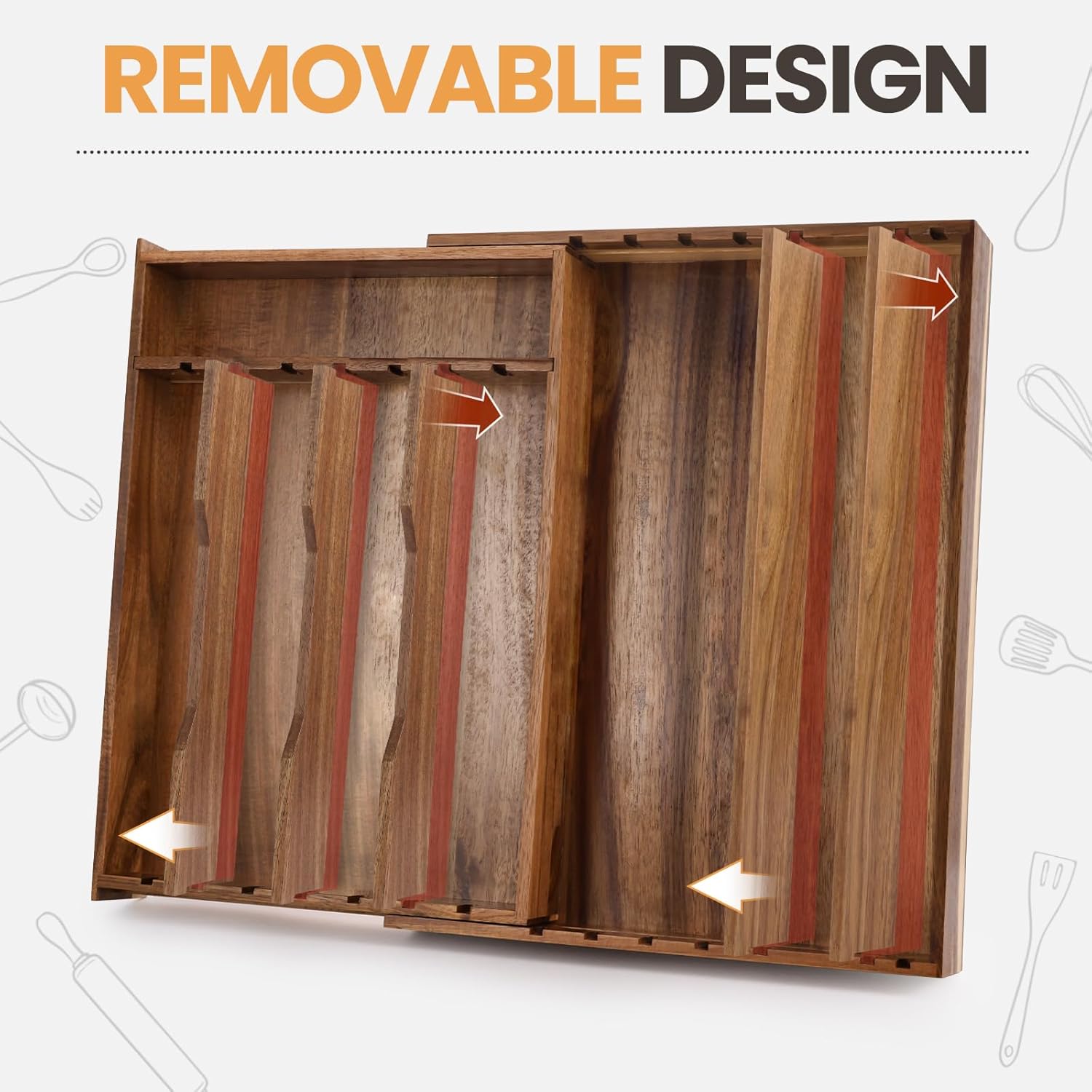 - Detachable Wooden Organization: Our silverware storage rack has 5 detachable wooden partitions. Easily rearrange or remove them to create the perfect compartment for your knives, forks, spoons, cooking tools, and even larger kitchen gadgets. Design a storage solution that perfectly fits your unique drawers and collections