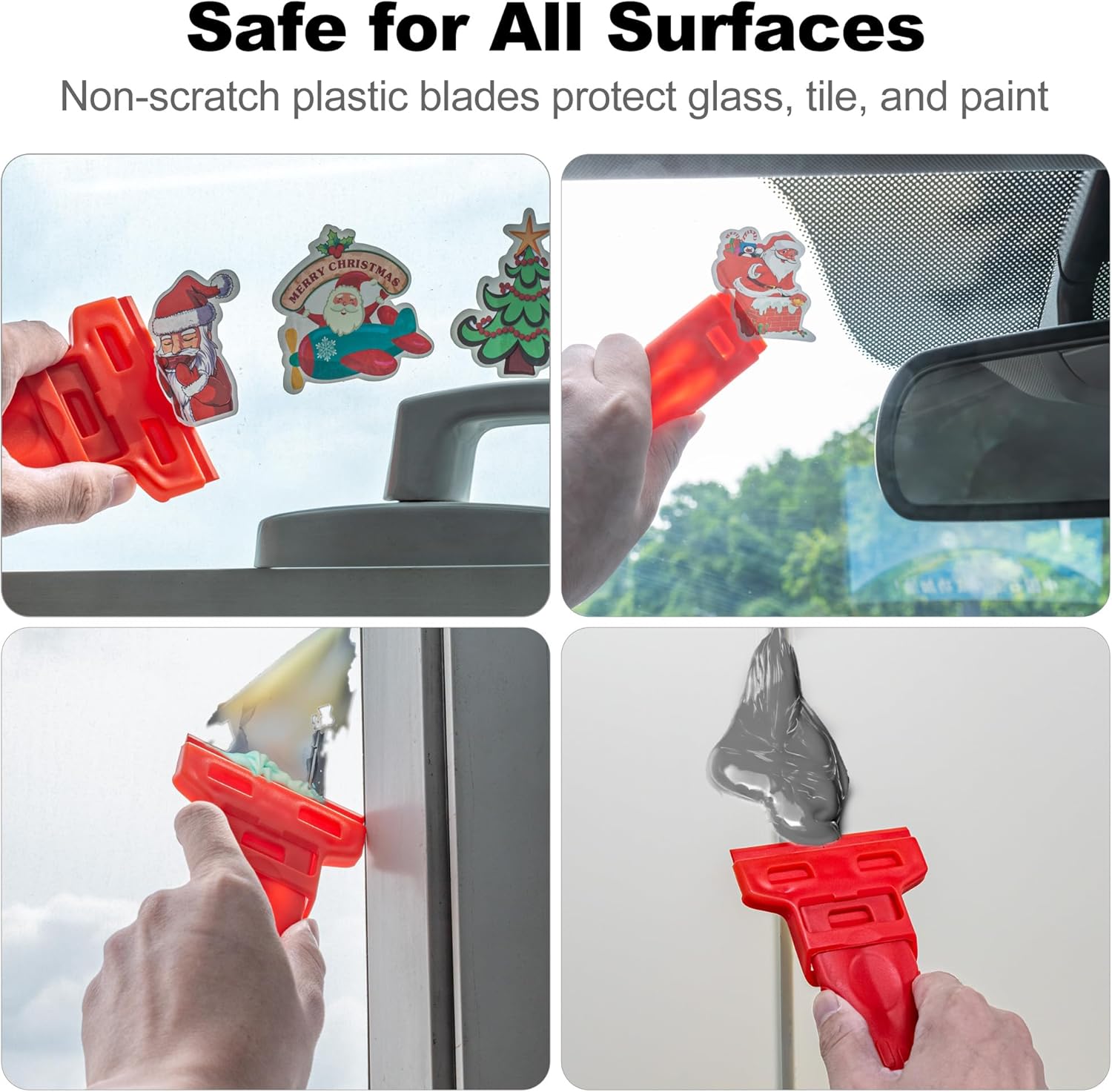- SURFACE-SAFE, NON-SCRATCH — Plastic edges lift stickers, decals, tape and paint specks without scratching glass, tile, or paint; ideal for cooktops, shower doors and car windows.