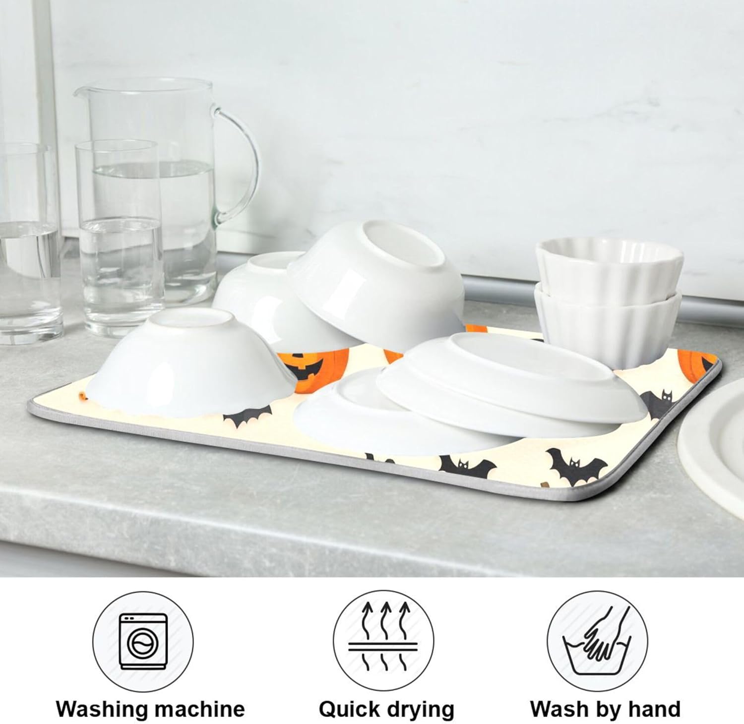 Halloween Black Bat Dish Drying Mat for Kitchen Countertop 16x18 Spooky Evil Pumpkin Lantern Small Drying Mat Reusable Quick Dry Dish Sink Mats Easy Clean Decorative Essentials